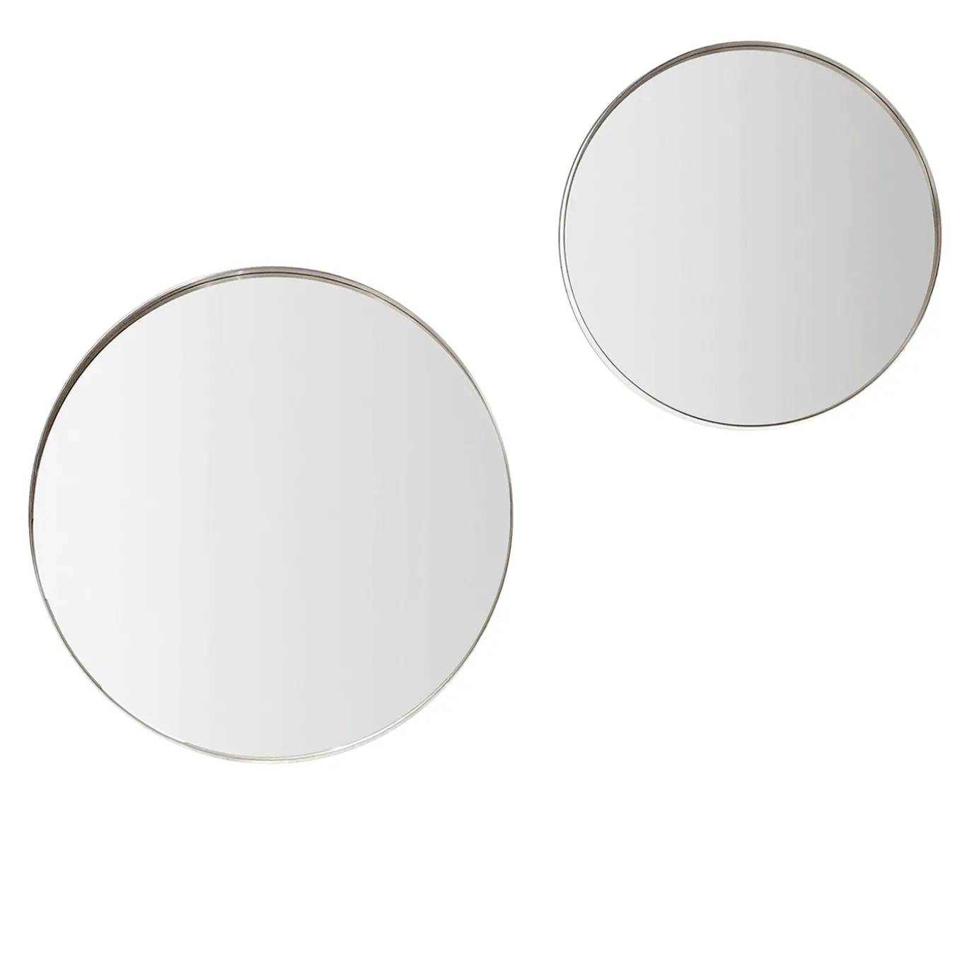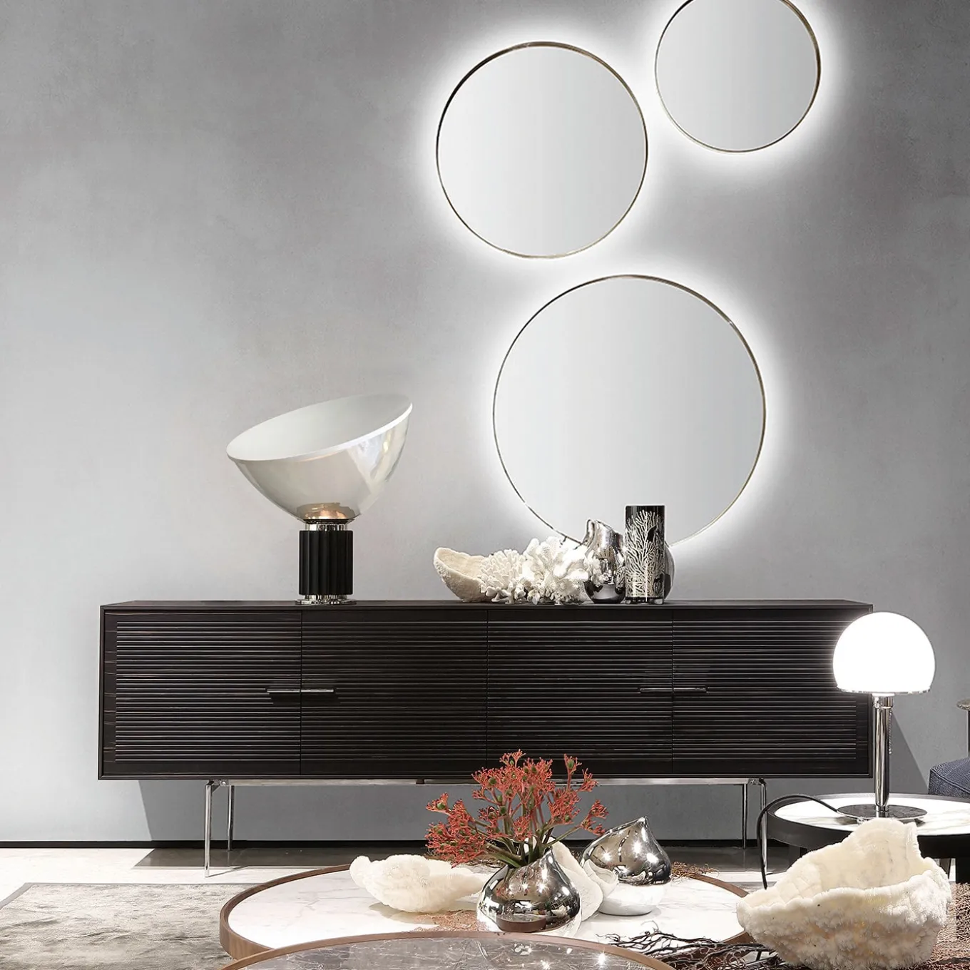 Pure shapes and intriguing design define this set of 2 (70cm and 90 cm diameter) circular mirrors, making for a spot-on addition to elegant contemporary interiors. A clever LED lighting system compatible with both Alexa and Google Home assistants allows for a stunning glow from behind, enhancing the perimetral steel frame’s titanium finish. The mirrors are also available for purchase individually or in sets of 3. Please contact the Concierge for different size options and finishing variants.