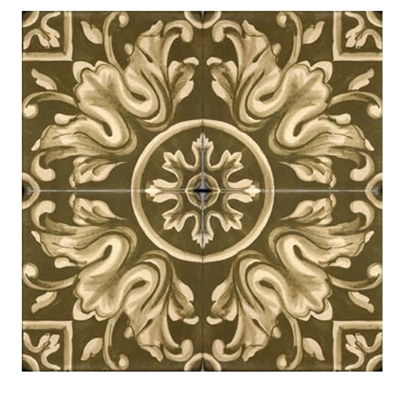 A perfect balance of forms and colors define these exquisite majolica tiles that will infuse elegance to both contemporary and traditional decors. Fashioned and painted entirely by hand, these four tiles come together to reveal a mirrored design characterized by a variety of fronds and leaf motifs in ivory that creates a striking swirling of forms. The accent motifs in the corners complete the piece, standing out against the brown background. Part of the Natura Collection, these tiles are best showcased in a series with minimal grouting to ensure a streamlined look.