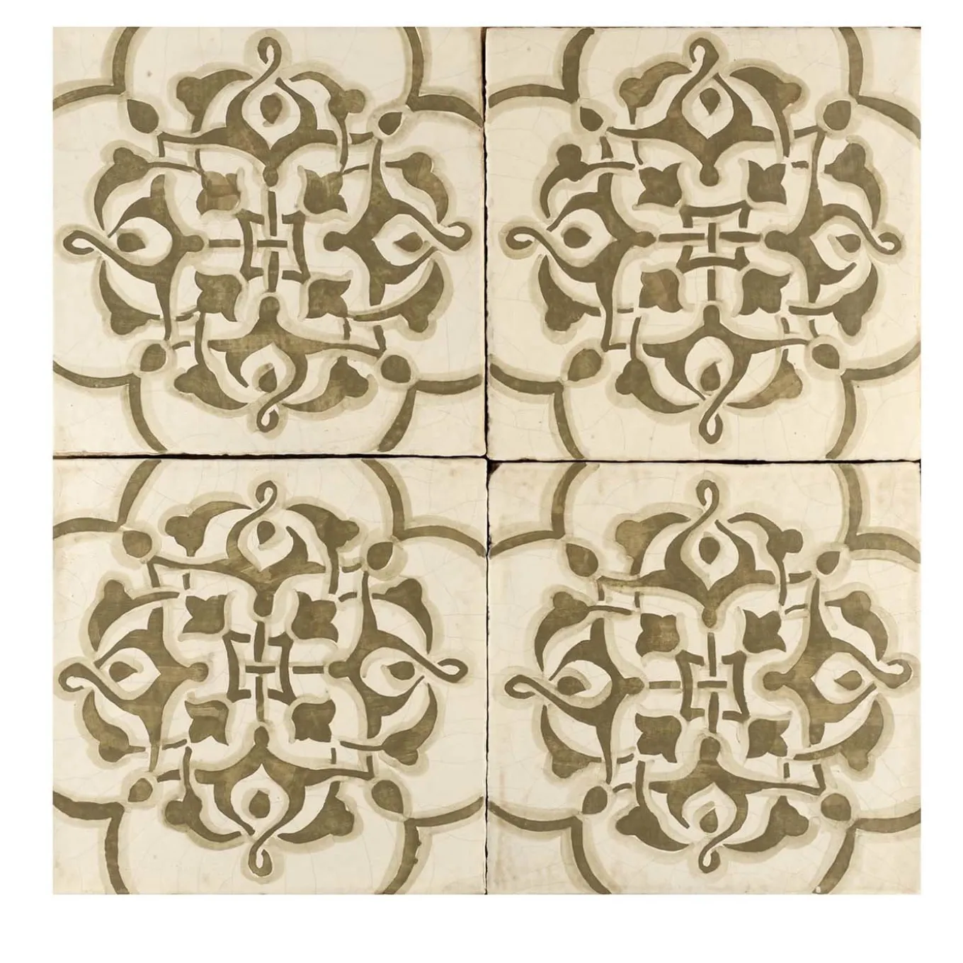 Visual harmony and warm colors characterize this sophisticated majolica tile from the Natura Collection. Fashioned by hand by master artisans, this tile boasts an ornate design with scroll and frond elements swirling and interweaving together to form a circular motif framed by a four-clovered outline. The brown-toned motifs stand out against the ivory background for a dynamic, three-dimensional look.