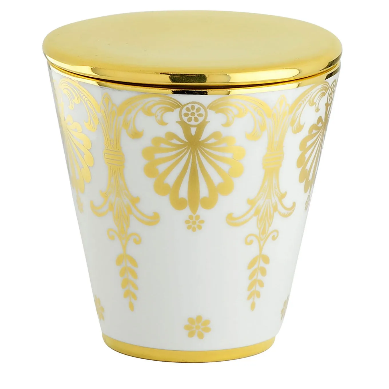The ideal synthesis between classic and modern references, this luxe candle will enhance any dresser, sideboard, or accent table with its discreet yet lavish allure. The V-shape porcelain body is defined by a dainty, Baroque-style pattern in pure gold the complements the gold finish ennobling the flat, circular lid.