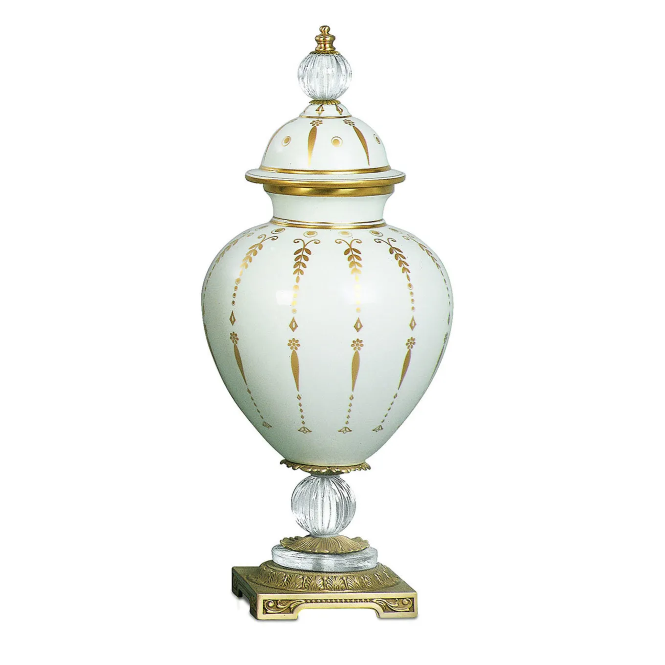 This luxe potiche is a fancy and elegant must-have for any classic decor, from consoles to dressers. Resting on a footed, square base in gold-finished metal that is intricately etched with Baroque-style patterns, its rounded body is adorned with golden, floral decorations also extending throughout the dome lid. Glass inserts with a ribbed texture embellish the base and lid as precious finials.