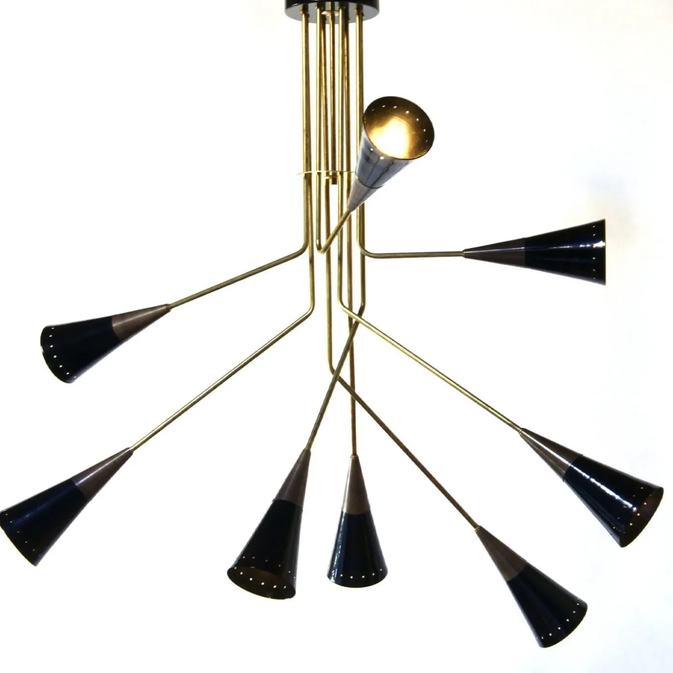 A project that arose during a dinner between friends, this chandelier by renowned designer Carlo Nason was conceived as a bundle of stems, each able to rotate for customized light effects. The branched brass structure is equipped with a ring keeping the upraising arms parallel, each culminating with a conical black-painted aluminum shade. It fits eight E14/E12 lightbulbs. Explore customizations with the Concierge.