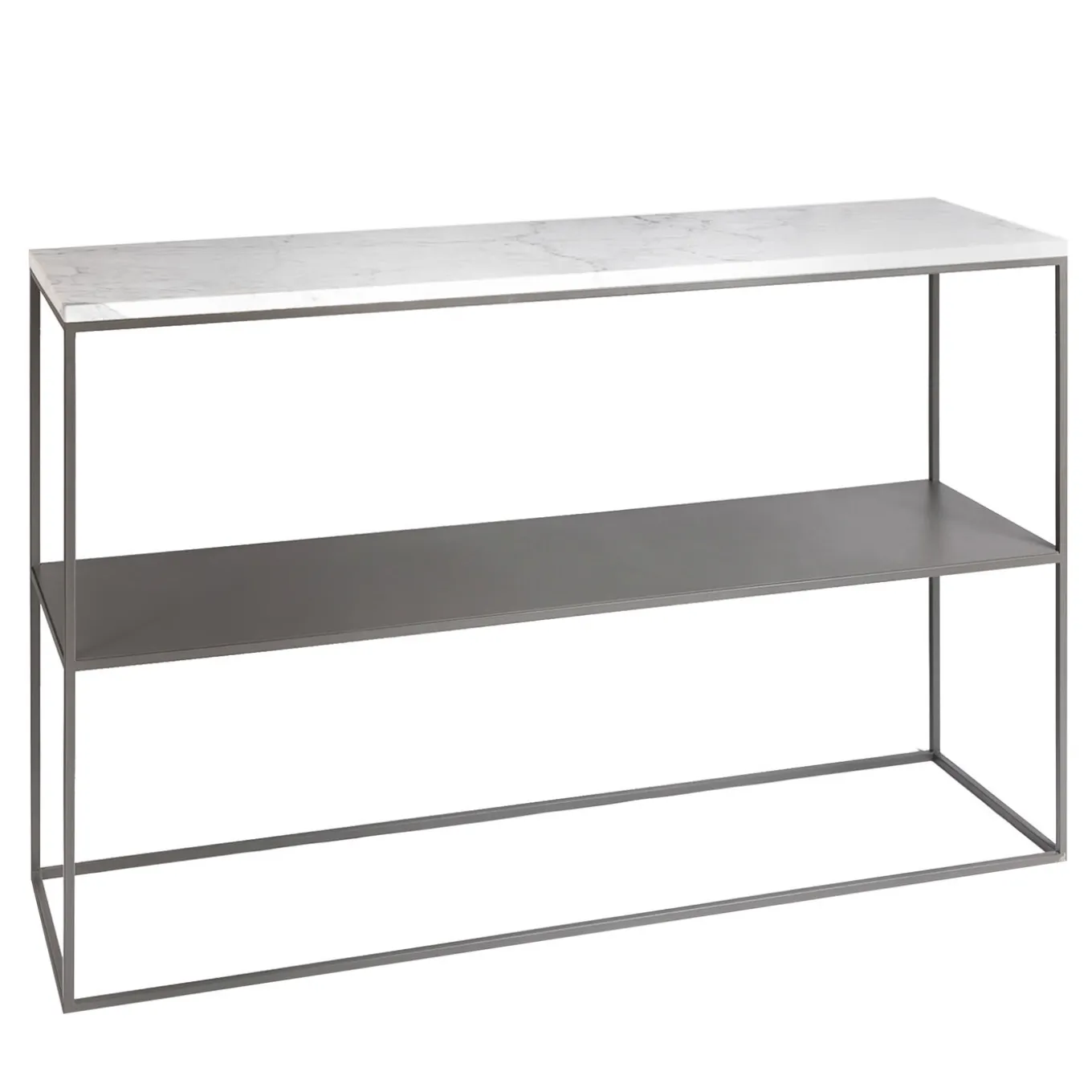 Striking piece to add an uplifting accent to a contemporary entryway, this remarkable console is the result of the marriage between industrial-chic style and prized natural materials. Its parallelepiped-shaped structure in gray-lacquered metal is soldered by hand and also offers a practical shelf that is juxtaposed to the luminous rectangular top in statuary white Carrara marble. Other metal finishes and marble types are available, please inquire with the Concierge for details.