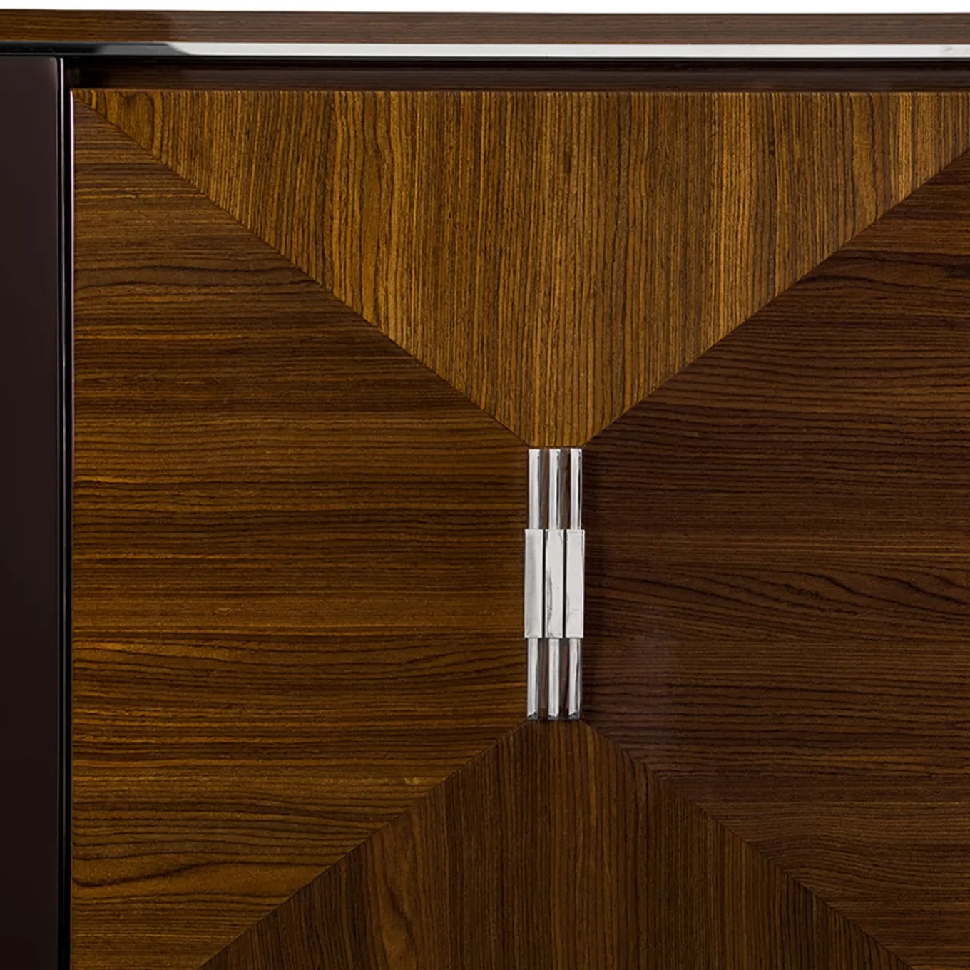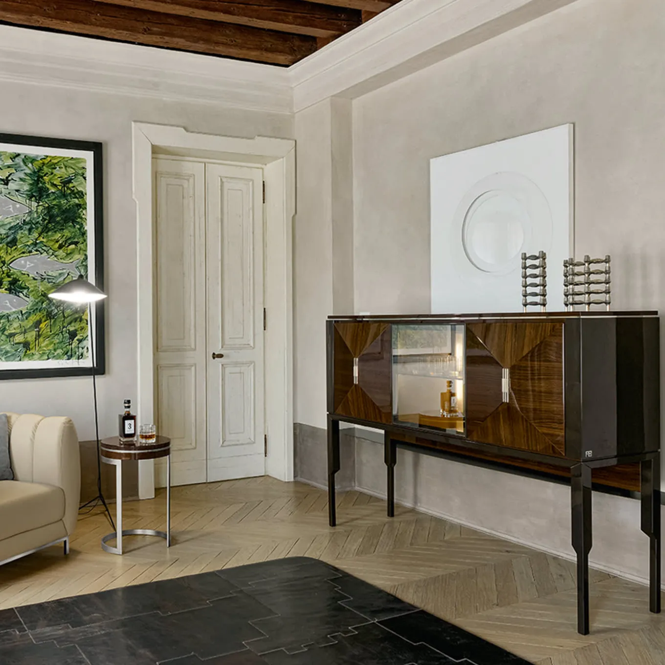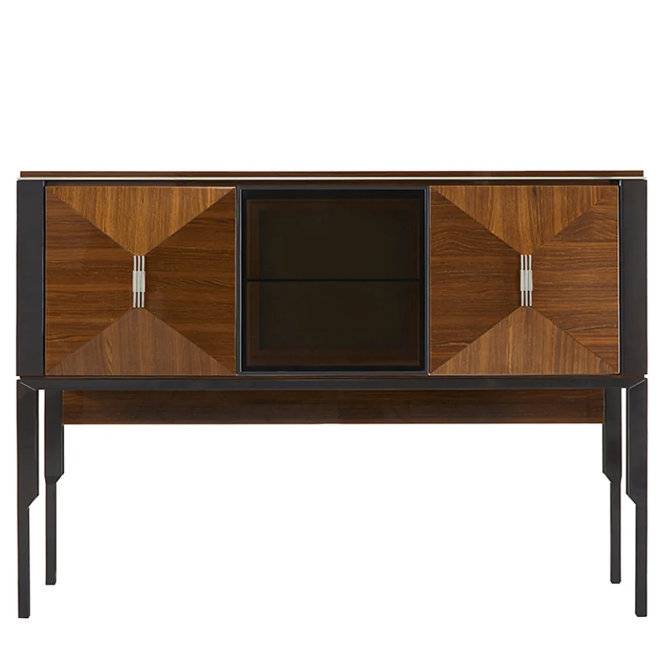 This elegant bar unit has two wooden doors and a glass one, with metal trims and lacquered legs. Wooden shelves and push pull opening complete the design. Canaletto glossy finish and Testa di Moro glossy lacquered frame finish are combined with details made of Gold metal and Smoked glass.