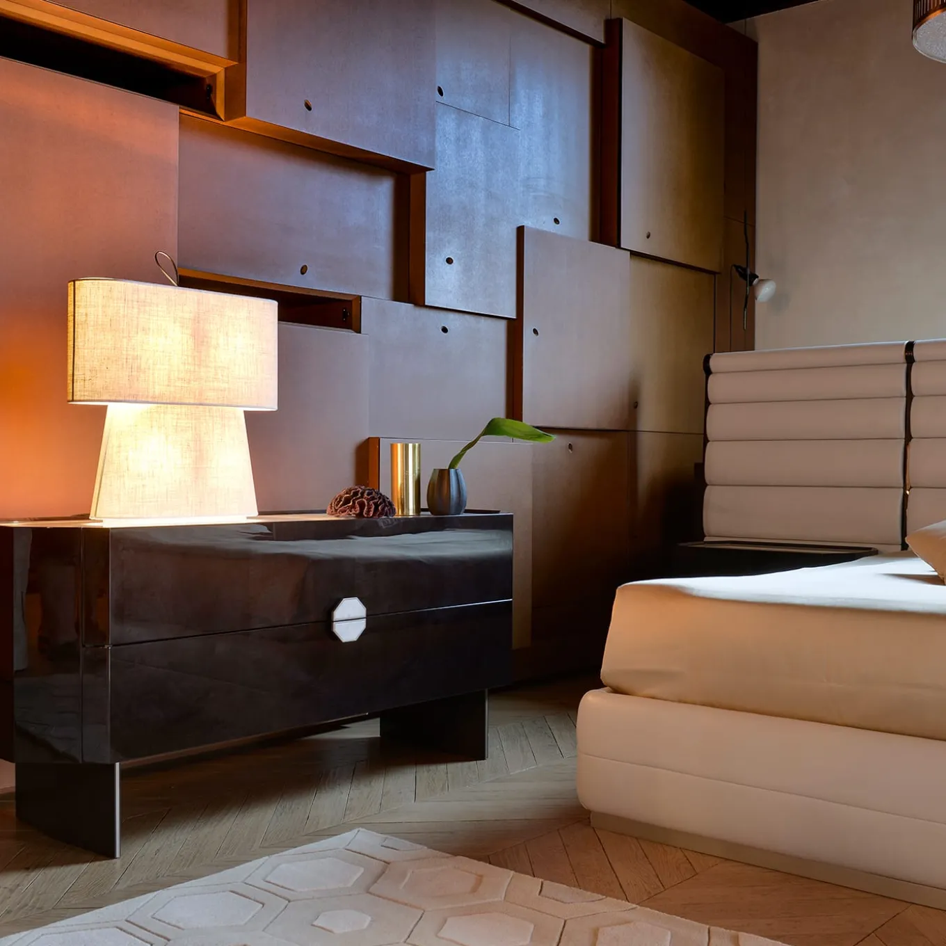 This elegant chest of two drawers has a Carrara marble top, metal trims and lacquered legs. Opening is facilitated by a precious marble handle. Characterized by Pantera glossy finish, details are made of Nickel metal.