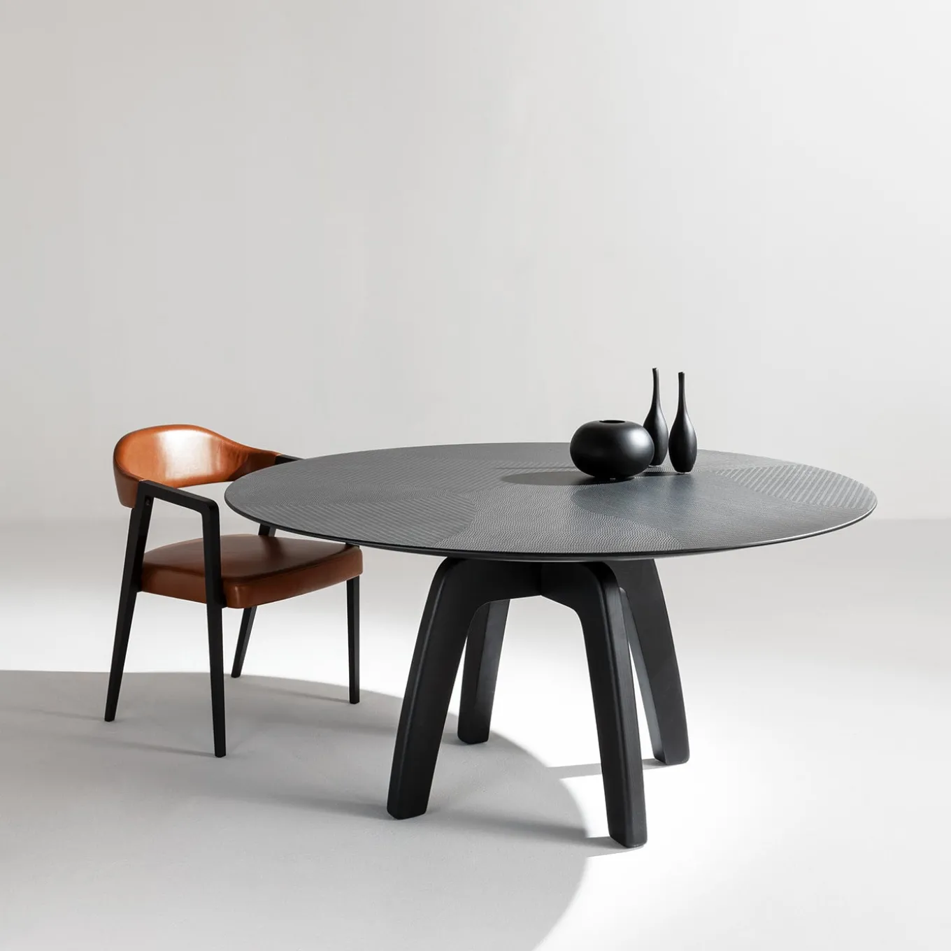 A sleek and contemporary round dining table with a solid black dyed wood structure. The tabletop is meticulously decorated with a refined wood inlay, adding depth and texture to its minimalist form. With legs in solid wood, this piece is designed to be a statement of elegance in modern interiors. Available in multiple dimensions, it can be customized to suit individual preferences. Contact the Concierge to explore options.
