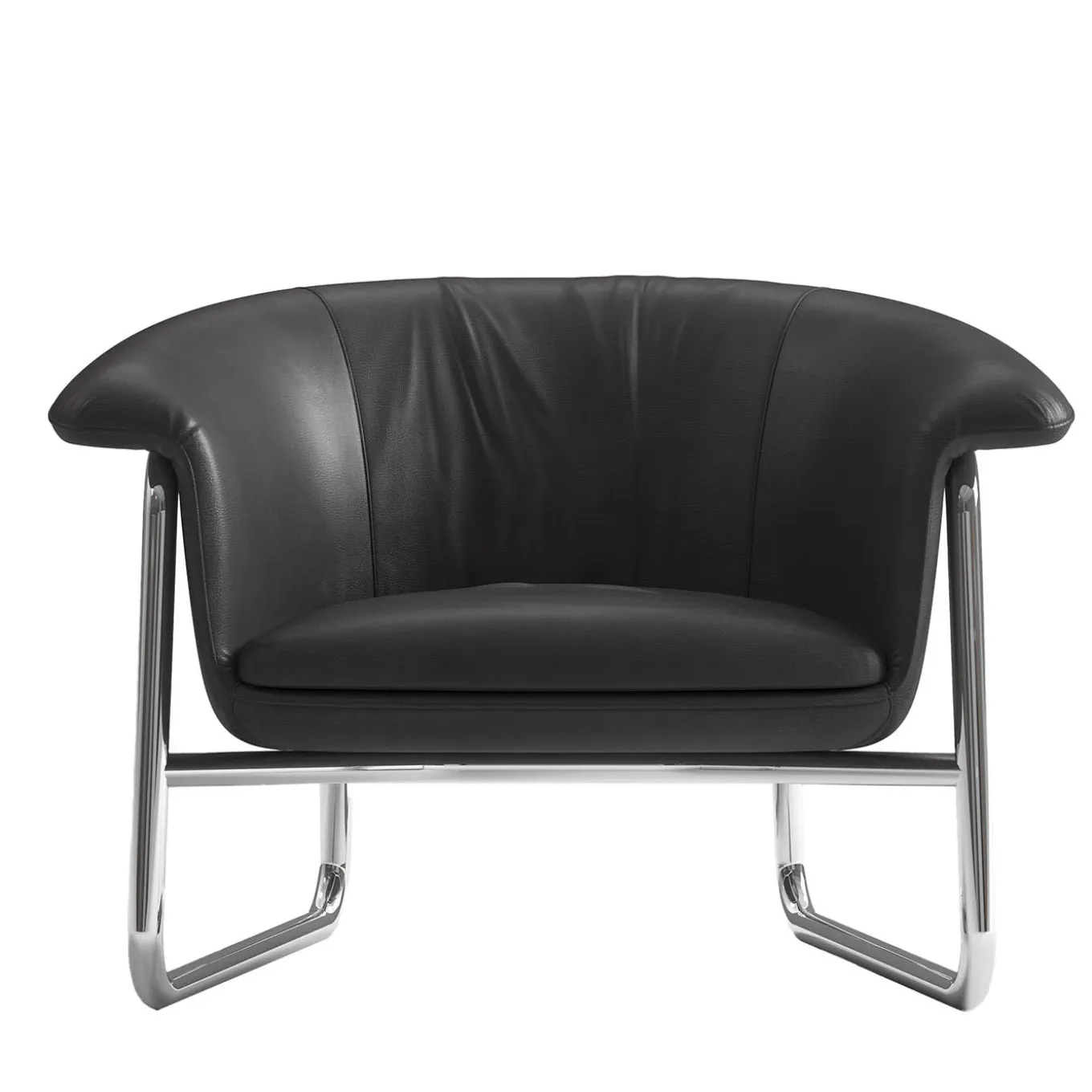 The elegant armchair features a sleek, chromed metal frame that adds a modern touch. It is upholstered in luxurious leather. Ideal for contemporary interiors, the armchair combines style and comfort seamlessly.
