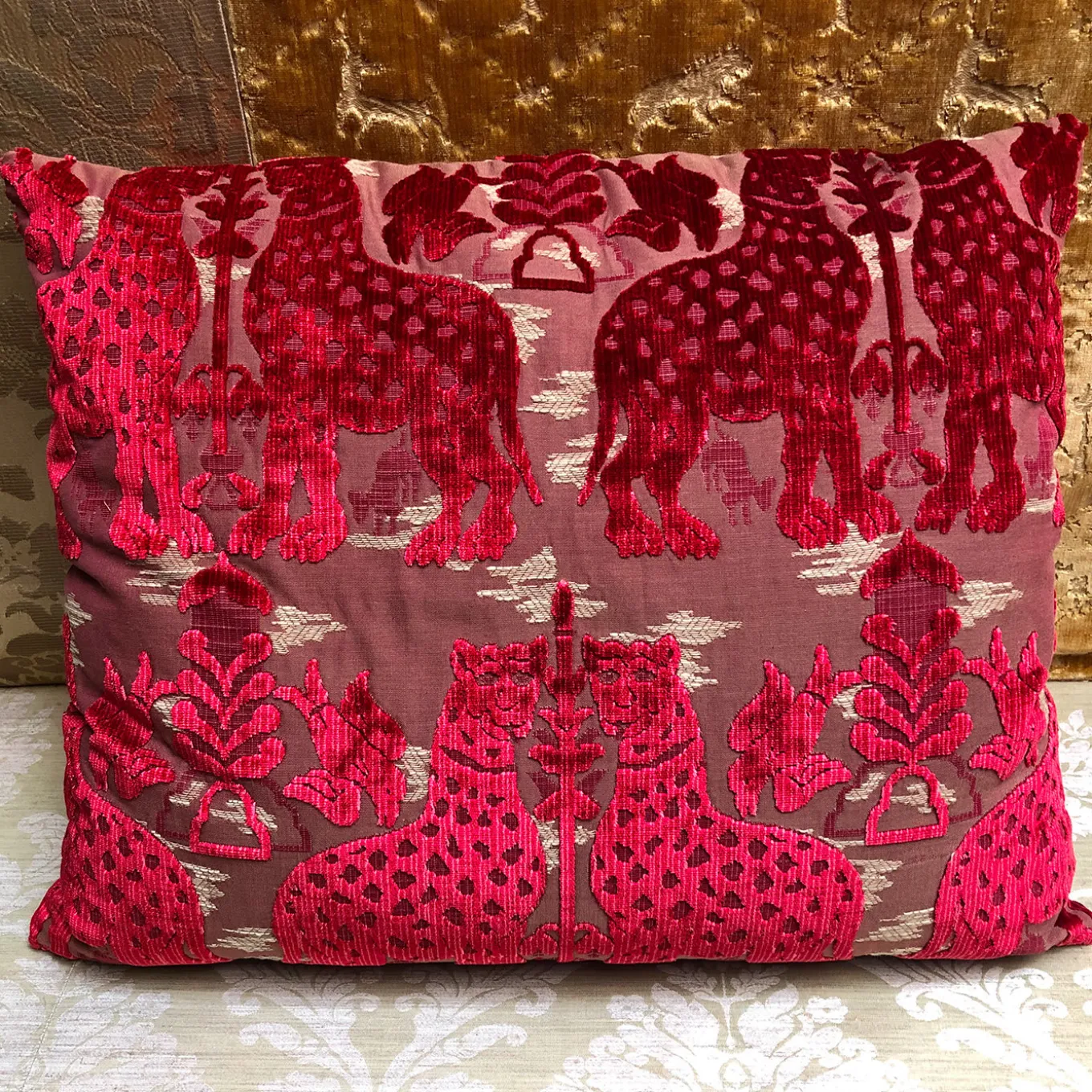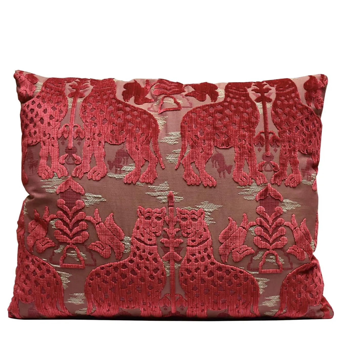 An elegant velvet where the main motif is animals that defend the sacredness of the tree of life symbol of eternal life. This is a reproduction of a thirteenth-century drawing. Masterfully crafted with vibrant colors, this piece creates a striking visual impact in a modern living room or traditional bedroom. This piece is finished with zipper closure.