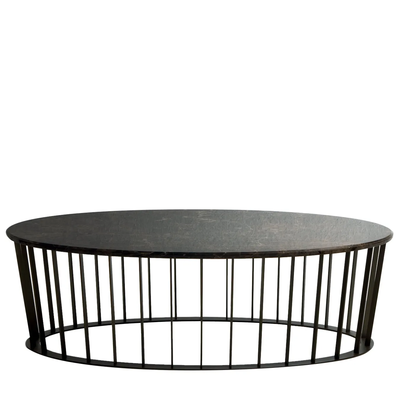 Durable, versatile and captivating, this oval coffee table defines a living room space with its ample physical presence and industrial-inspired design. The supporting structure is made of metal slats finished in a dark matte bronze color that are arranged on the ring base in a fence-like design. The oval top is crafted of black marble enhanced by golden veining, a modern and elegant combination that is versatile and timeless. Available also with top in eucalyptus wood and chrome-finished base. Ask the Concierge for details and price in these options.