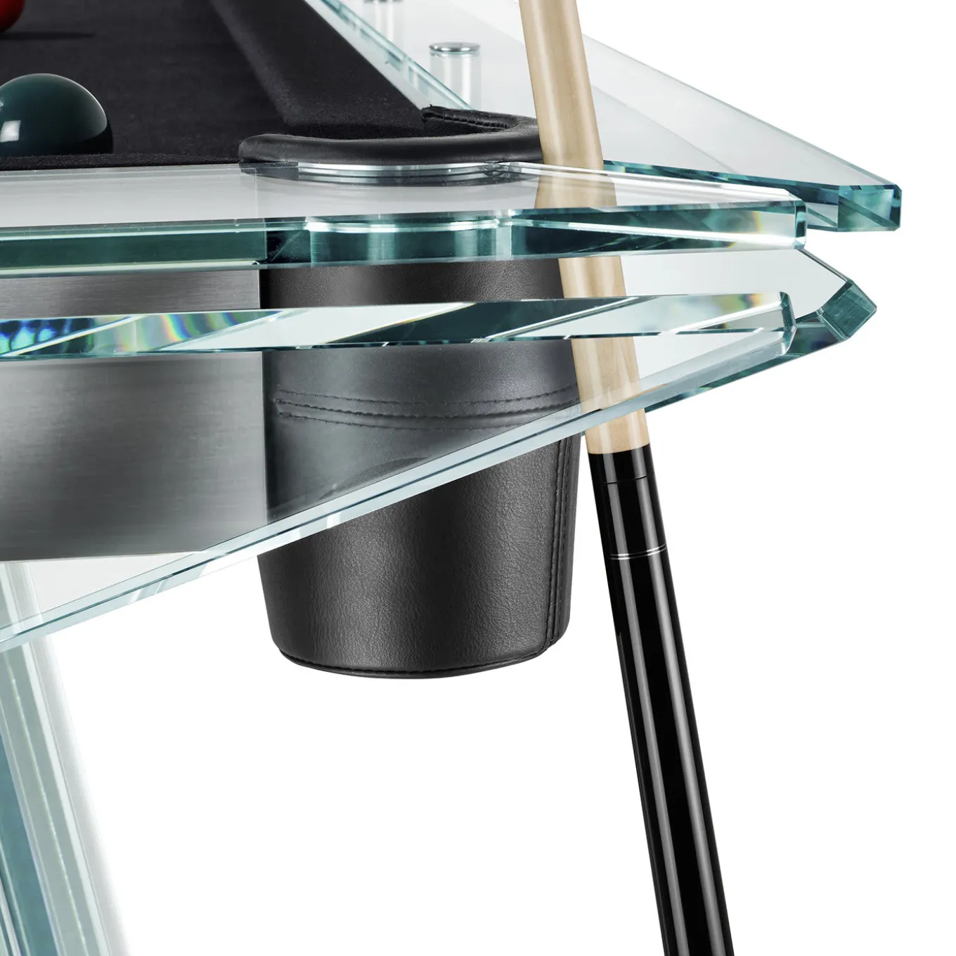 Filotto brings new life, characteristics, and values to the classic billiards table. Its design, construction, and workmanship are all Italian – showcasing the highest expression of technological sophistication and craftsmanship that has always distinguished Italy from the rest of the world. Its top appears to be floating in mid-air due to its transparent, crystalline legs. Four sticks, a professional cue-ball set with a leather box, and a leather triangle rack are included.