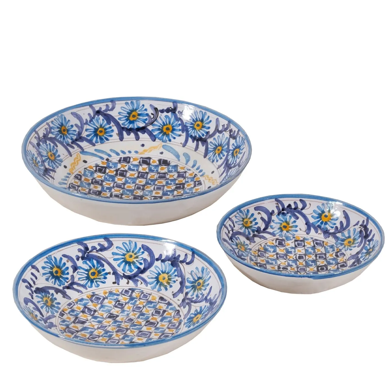 An original design by Lorenza Adami, this set of three bowls is minutely handcrafted of fine maiolica decorated with a stupendous blue, white, and orange motif that combines a Chechen pattern with floral decorations. Perfect to serve appetizers and small bites, the three pieces measure 10, 15, 20cm x 5cm h. Not suitable for microwave, washable by hand.