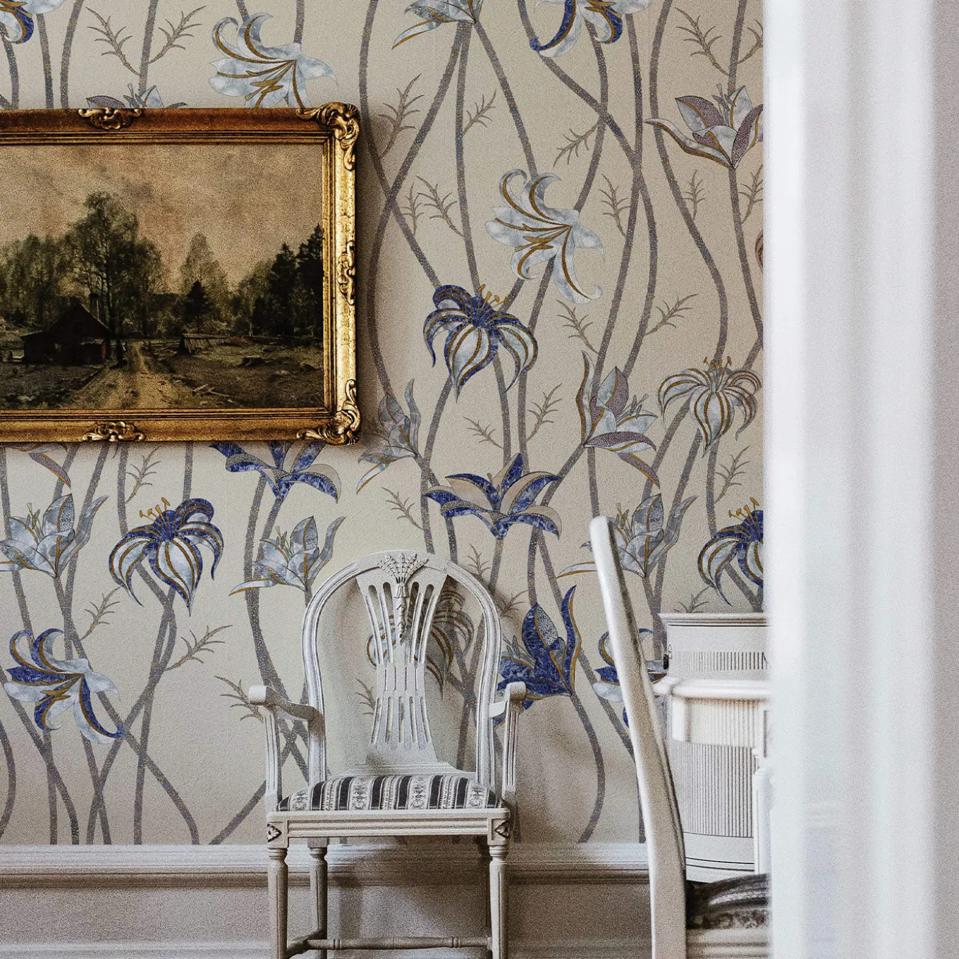 Fine and very long stems run along the whole wall, to end as super-light flowers of Lilium Lancifolium, best known as Tiger Lily. After a careful look at these flowers’ designs, it is possible to catch sight of colors and textures that are part of another reality: the ancient technique named Scagliola, the Art of Moonrock. The wallpaper Fiori is freely inspired by this very ancient art, which consisted of the skillful workmanship of plaster. This was then used to replace more precious materials.