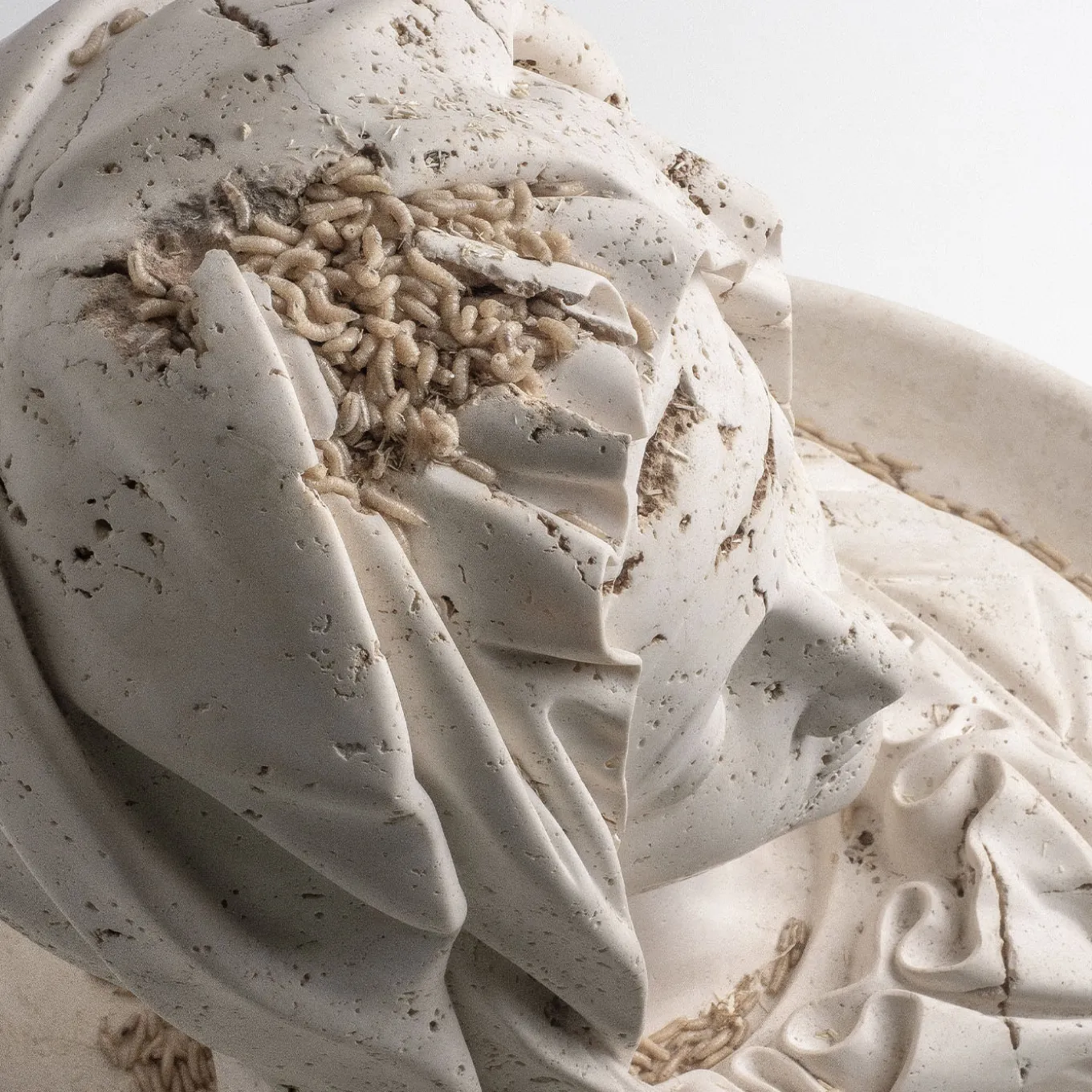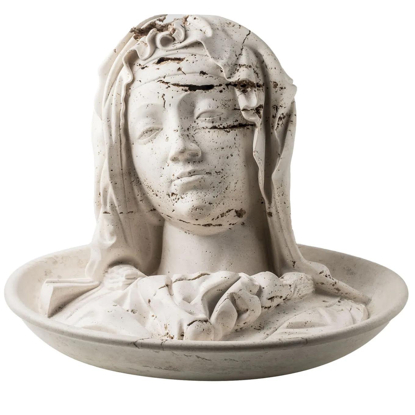 The head of the Virgin Mary from the La Pietà masterpiece by Michelangelo is masterfully recreated in this contemporary sculpture through a minute manual sculpting of fine Travertine marble, characterized by singular holes and cracks. Precisely by following the natural imperfections of the stone, artist Matteo Peducci underscores the concept of relentless decay.