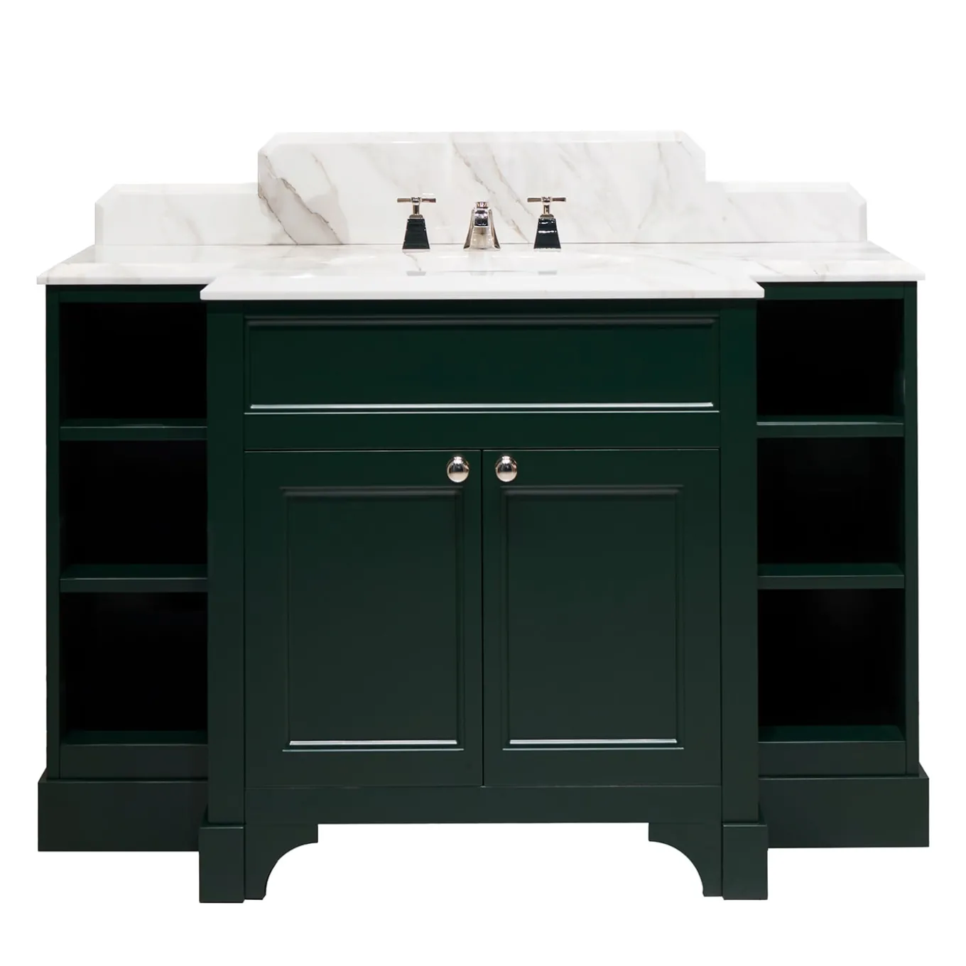 A vanity unit for bathrooms of impeccable elegance, characterized by a simple design that retains the timeless beauty of neoclassical style. The Vanity Unit is composed of a White Carrara marble top and backsplash, brass knobs and an English green frame in lacquered wood. Faucets are not included. Please, contact the Concierge for customization options.