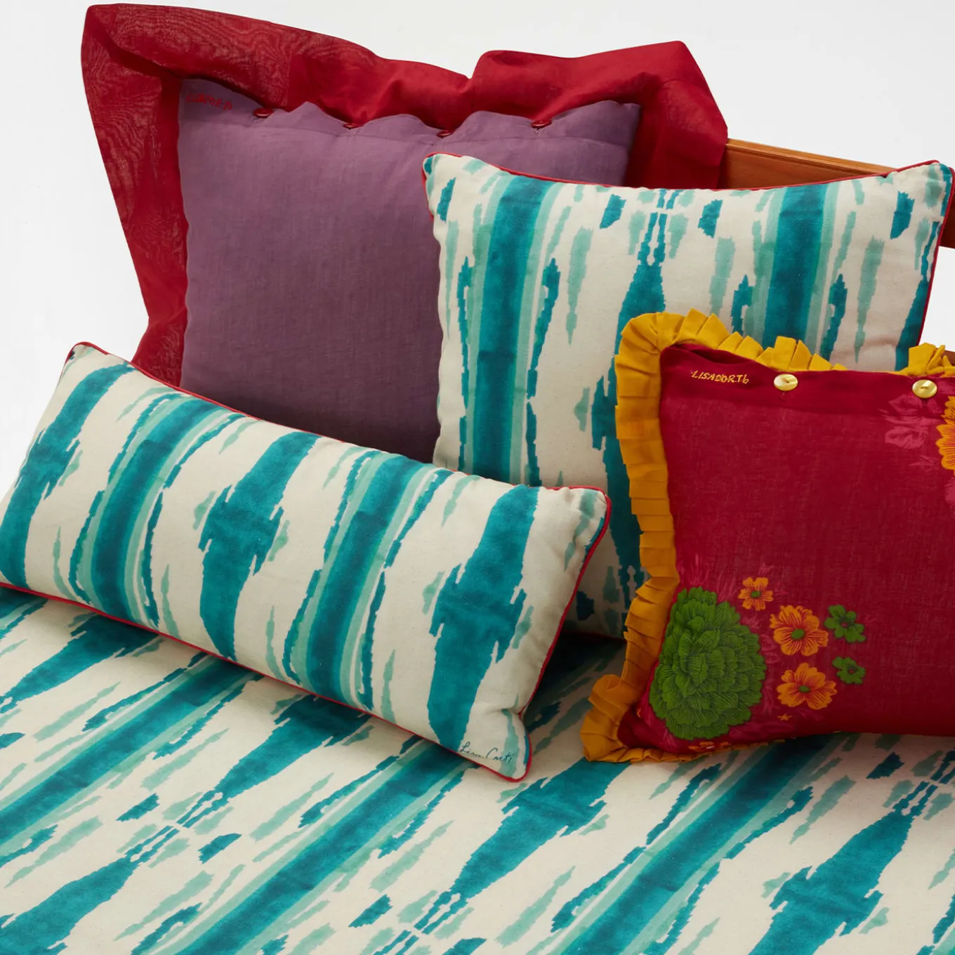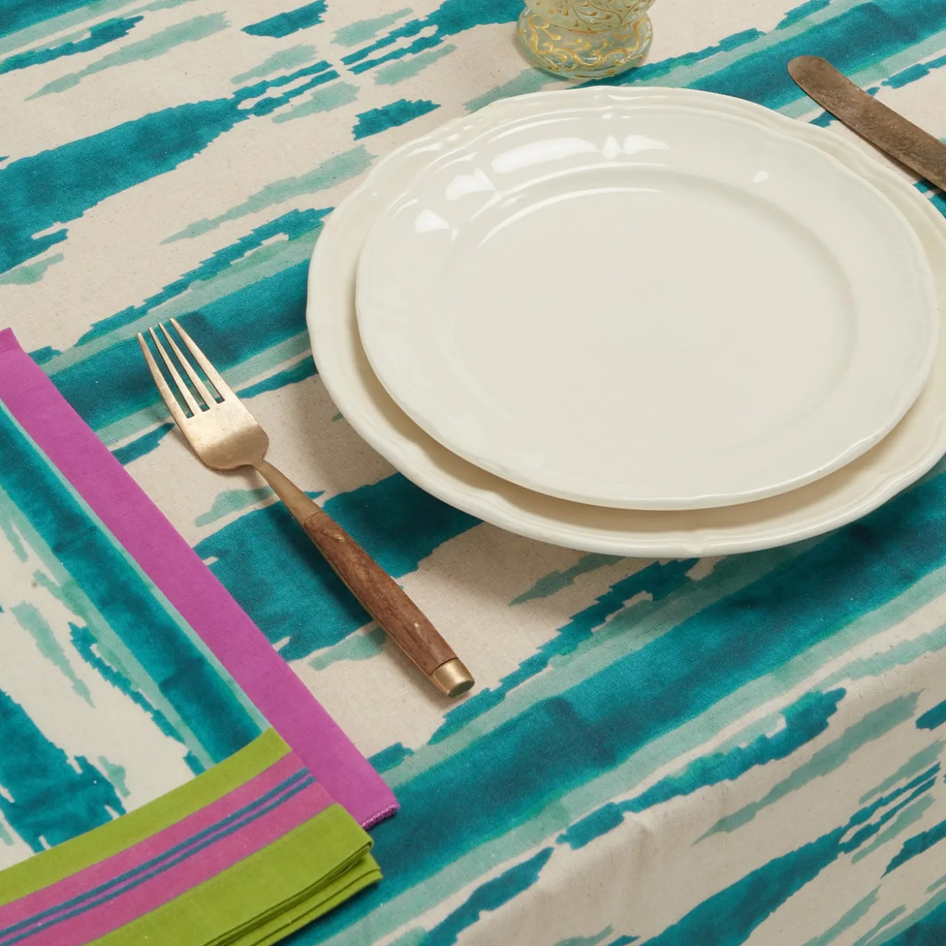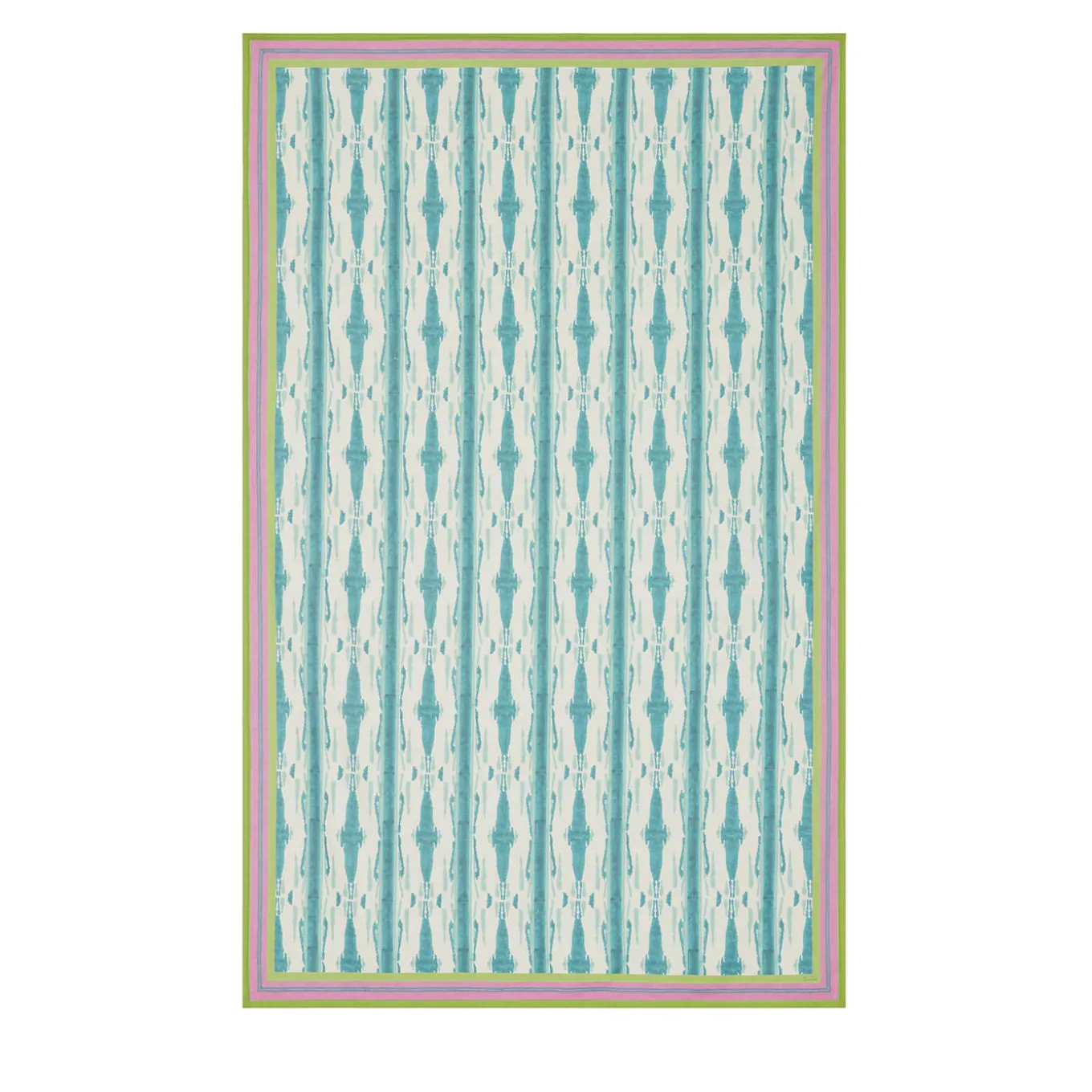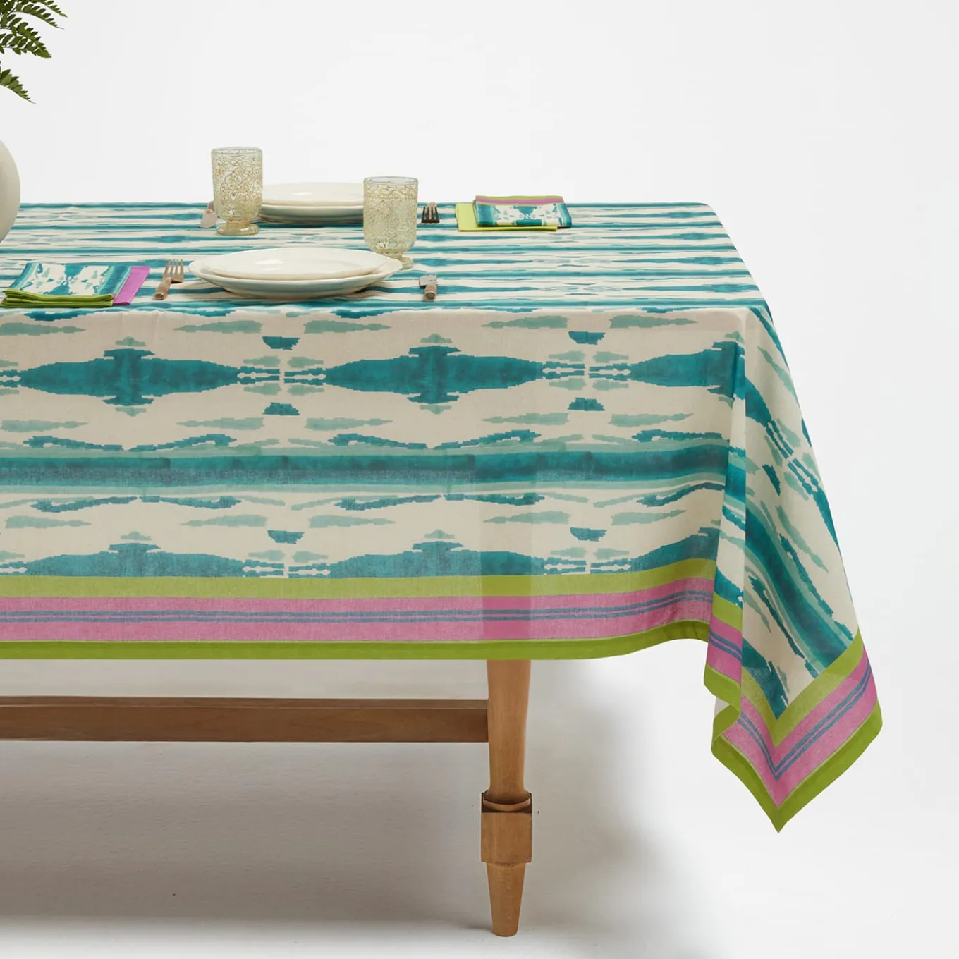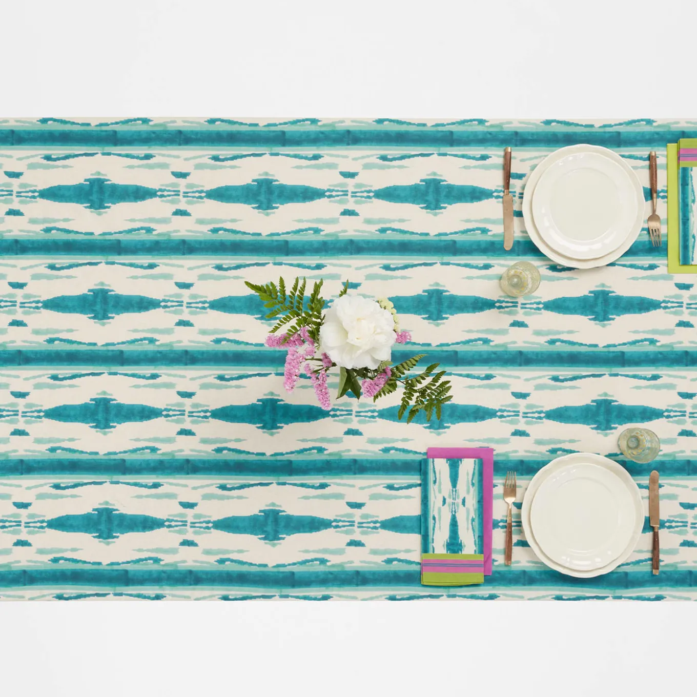 Available in other vivid color options, this exquisite tablecloth in prized cotton is a unique piece printed following the traditional, manual “block print” technique for a mesmerizing pattern reminiscent of the hypnotizing motifs typical of peacocks’ plumage. Pink, blue and acid-green stripes alternate along the edges, creating a bold frame effect that adds further chromatic vibrancy to the piece. Digitally printed in Italy.