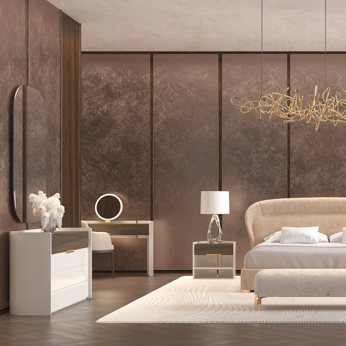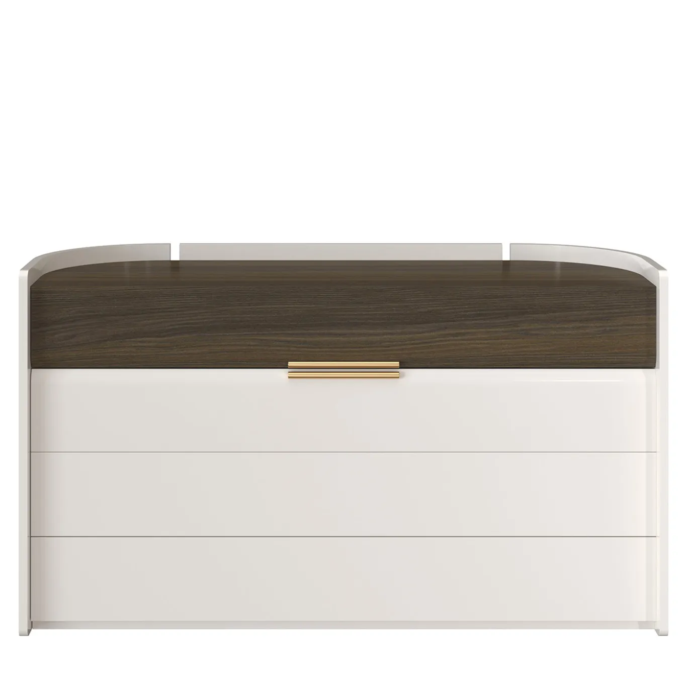 This chest of drawers features a medium size with four spacious drawers, combining white lacquer and wood veneer for a balanced, elegant look. Its contemporary design integrates seamless curves and a functional gold handle, making it suitable for modern bedrooms or as a contrasting piece in classic interiors. The refined proportions and sleek finish promote a harmonious atmosphere, adding sophistication without overwhelming the space.