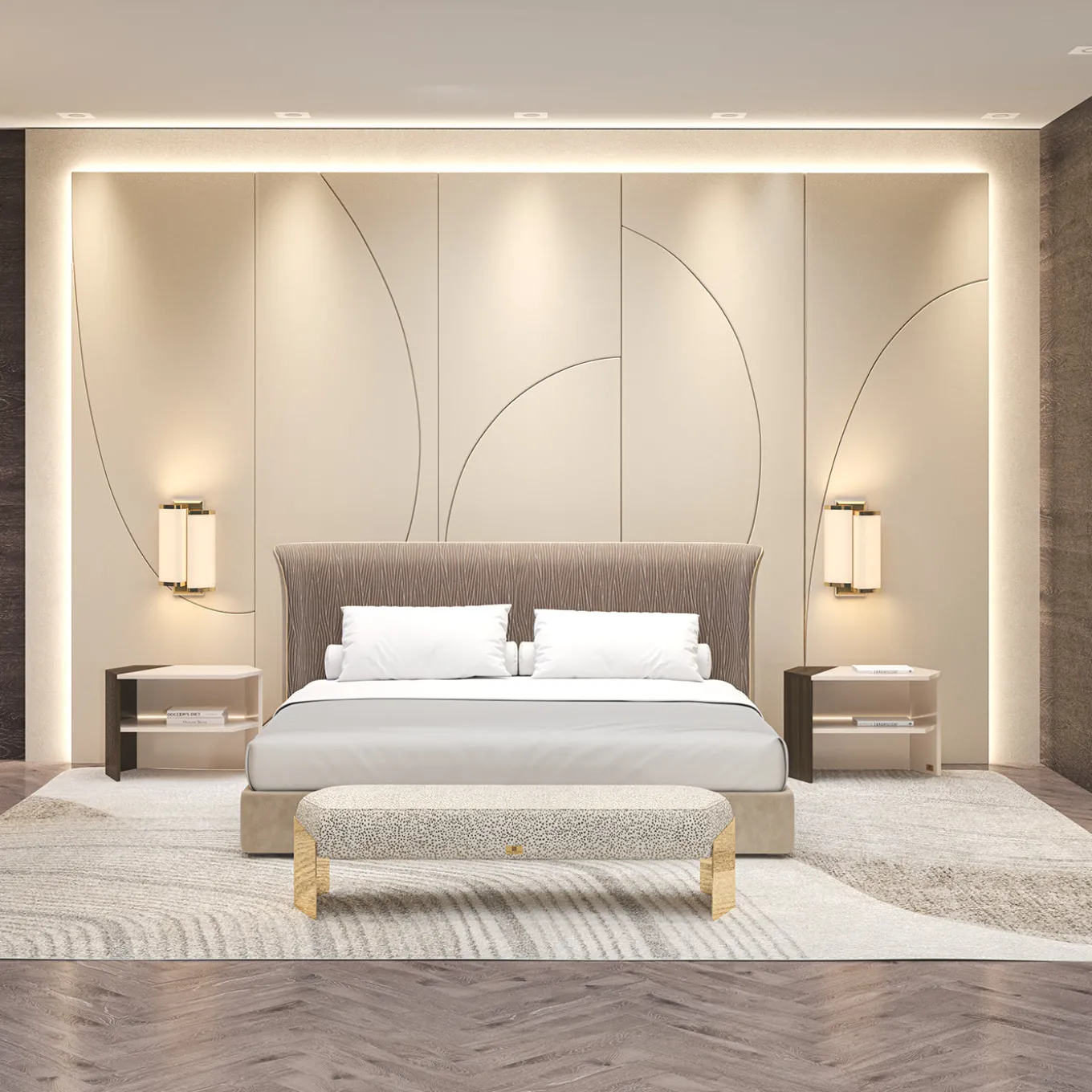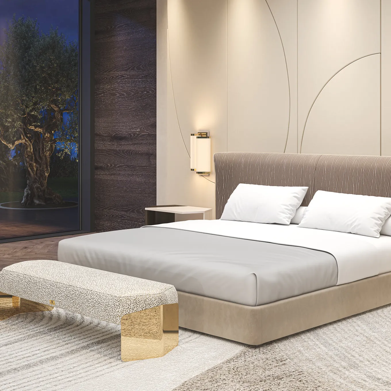 The Flare 03 gray bench features a sleek, elongated cushion with a subtle pattern that enhances its contemporary appeal. Supported by distinctive champagne-colored metal legs, it blends refined luxury with modern design. Ideal for adding functional seating in open living areas or corridors, this bench balances comfort with an elegant silhouette that complements both modern and traditional interiors.
