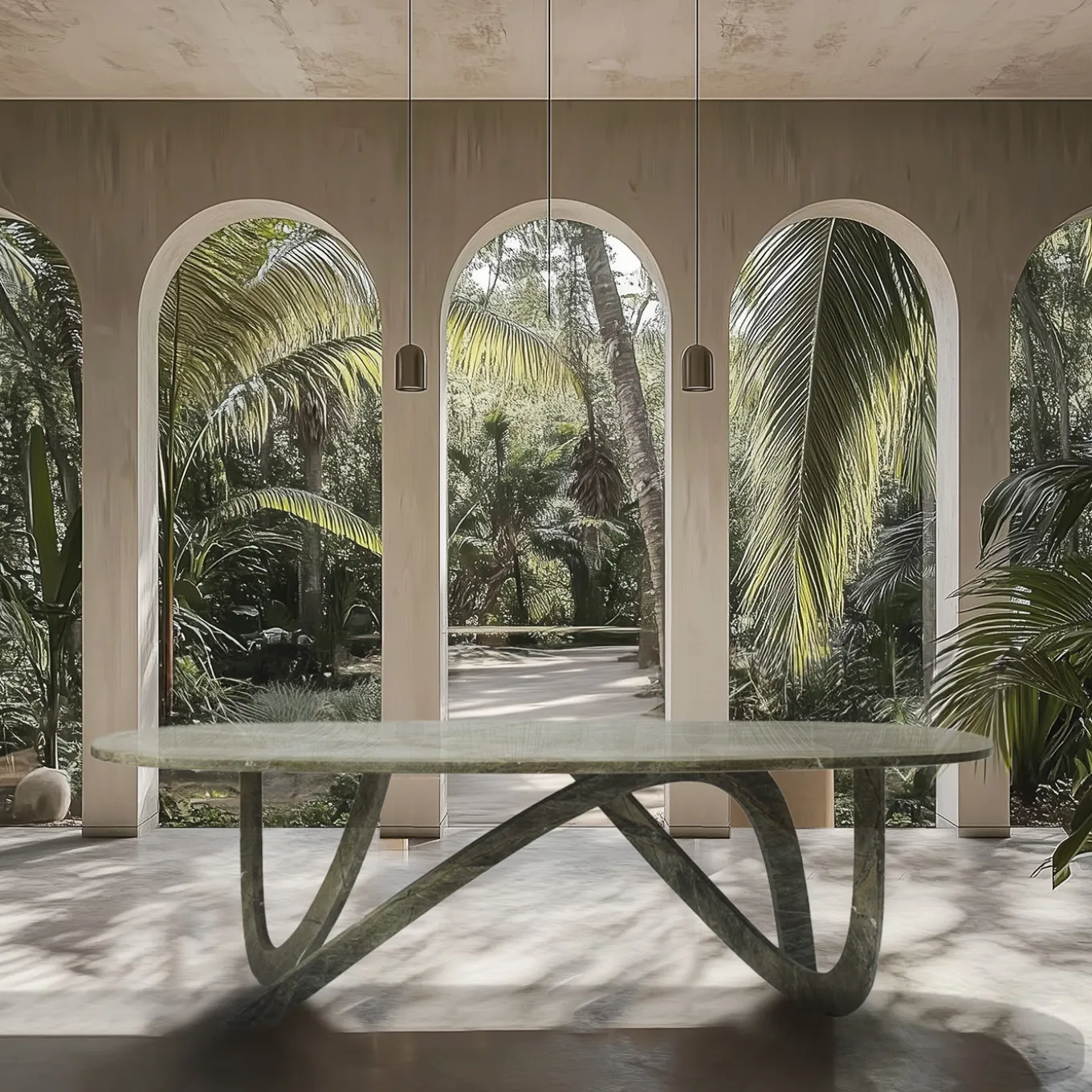 The Fleur green marble dining table features a contemporary reinterpretation of art nouveau floral decorations with a dynamic, sinuous design. Its sculptural legs appear to move autonomously, creating a sense of vitality and fluidity. The oval top complements the table’s striking base, making it a distinctive piece that balances artistic expression with functional elegance.