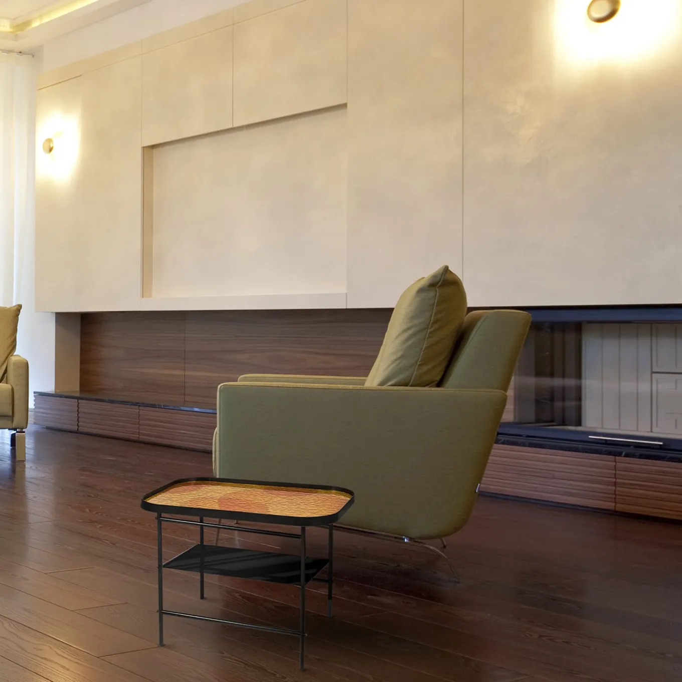 This elegant object of functional decor will imbue a modern dining room or living room with sophistication, providing two practical surfaces to hold and display everyday items, food and drinks, and collectibles. Its linear structure is crafted of brass with a black wax-based finish. The bottom rectangular shelf is in black glass, while the top one, which can be extracted and used as tray, features delicate round corners and a bottom in yellow glass with abstract decorations. This side table is also available in blue.