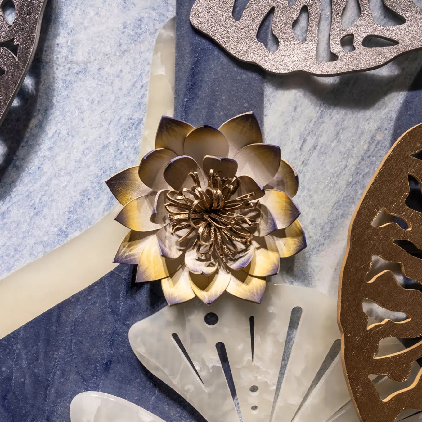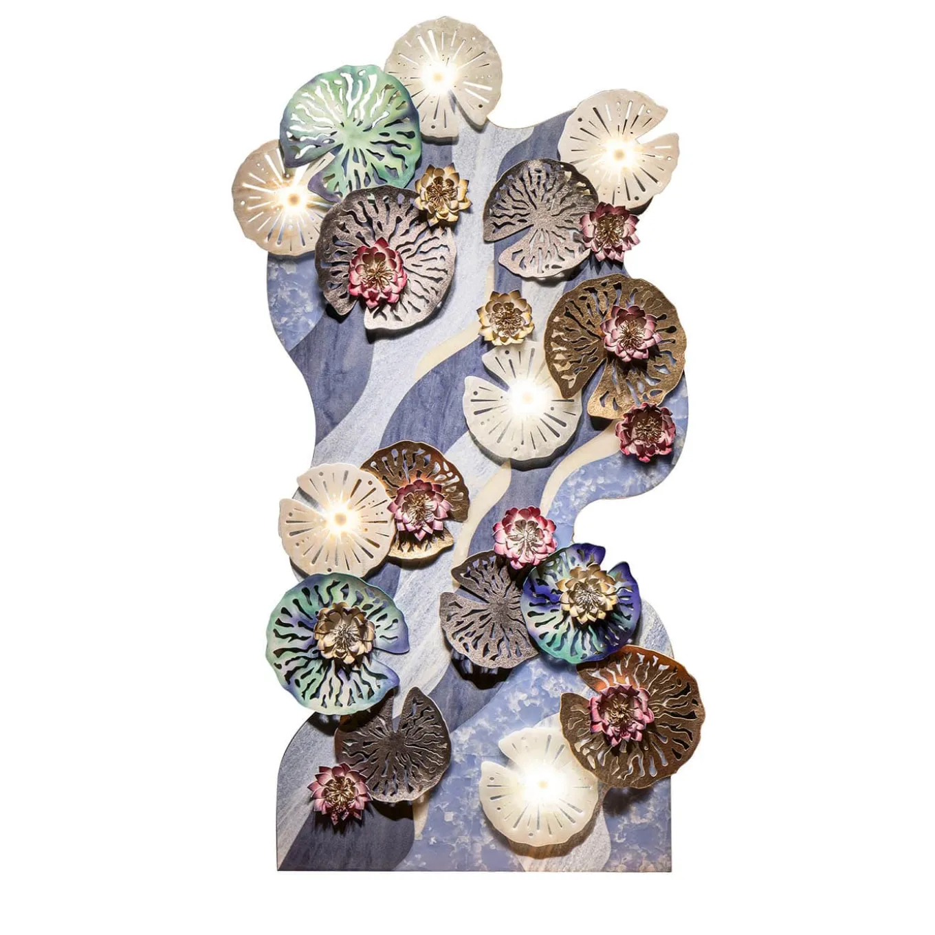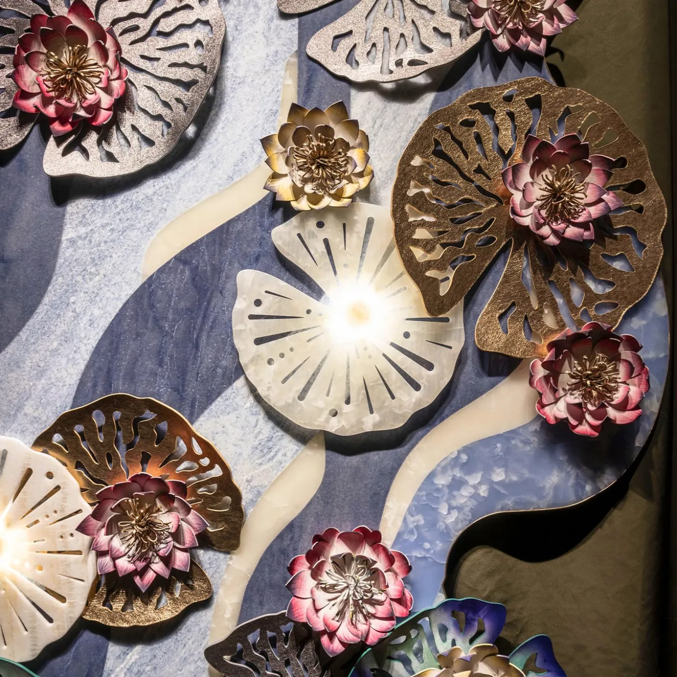 Inspired by Monet’s “Water Lilies,” this panel reinterprets the artist’s masterpiece into a modern, vertical installation. Collaborating with Budri, renowned for its expertise in marble and precious stones, the piece blends luxurious materials like marble, onyx, and leather. The intricate lotus flowers and water lilies, made from hand-painted leather and inlaid marble, create a dynamic, ethereal composition. With luminous colors and a sculptural design, it transforms any space.