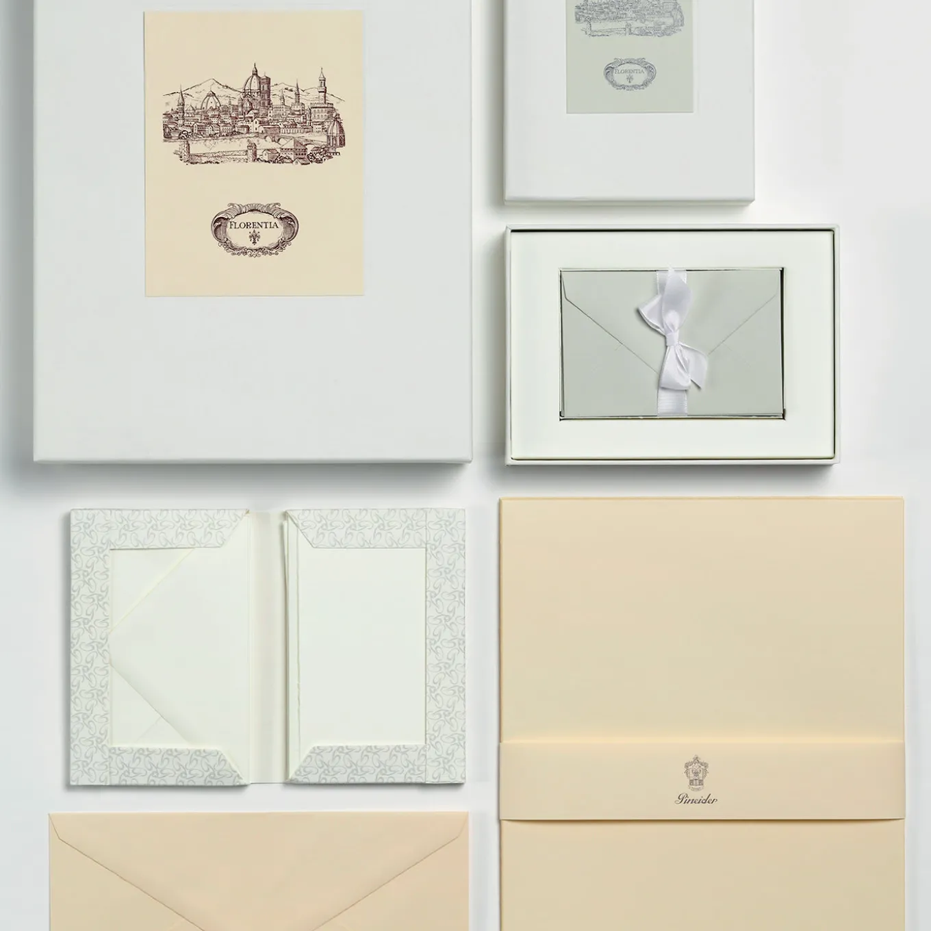 This precious box boasts a small print of a drawing of Florence enriched with the Pineider logo and contains 24 beige, white tissue-lined envelopes with a dry-executed Pineider logo and 24 matching cardboards with fringed-edge, smooth watermarked paper. This item is available in other color combinations, please ask the Concierge for options.
