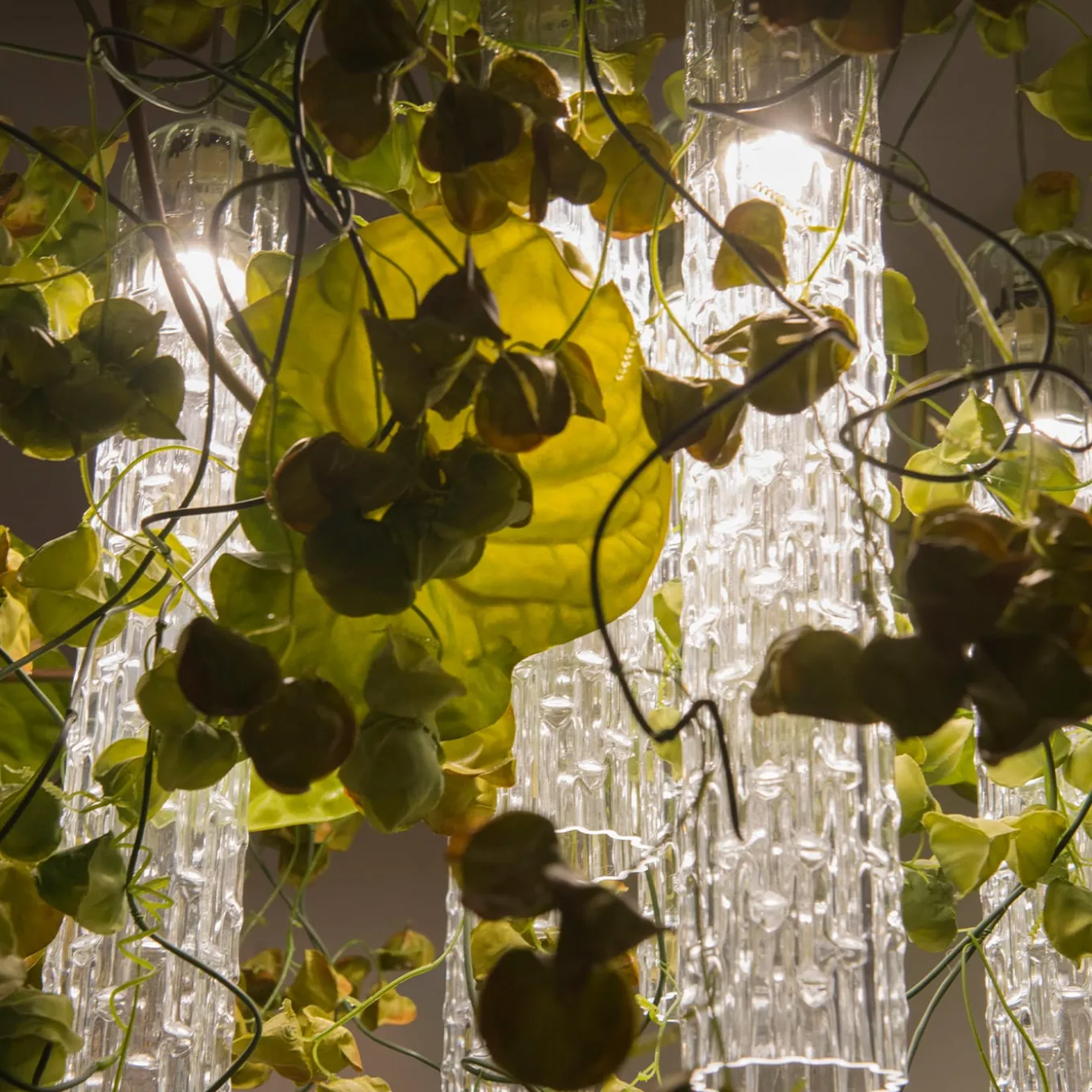 A unique complement to a refined interior of any inspiration or color palette, this ceiling lamp embodies the harmonious coexistence of man and Nature. It features spectacularly handmade Murano glass shades supporting ten GU10 x 6W LED lightbulbs and a magnificent cascade of synthetic physalis and anthurium flowers.