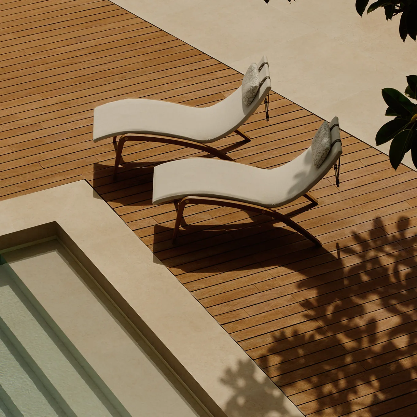 Foil is a refined outdoor chaise lounge defined by its sleek, sinuous silhouette and robust stainless steel frame in a black sablé finish. The seat is upholstered in Zagora fabric in a soft pomice tone, offering durability and a subtle texture. Solid iroko wood legs with a natural matte finish add warmth and contrast. A sand-toned Yucca fabric cushion, secured by manganese leather straps, enhances comfort while contributing to the lounge’s sophisticated aesthetic.