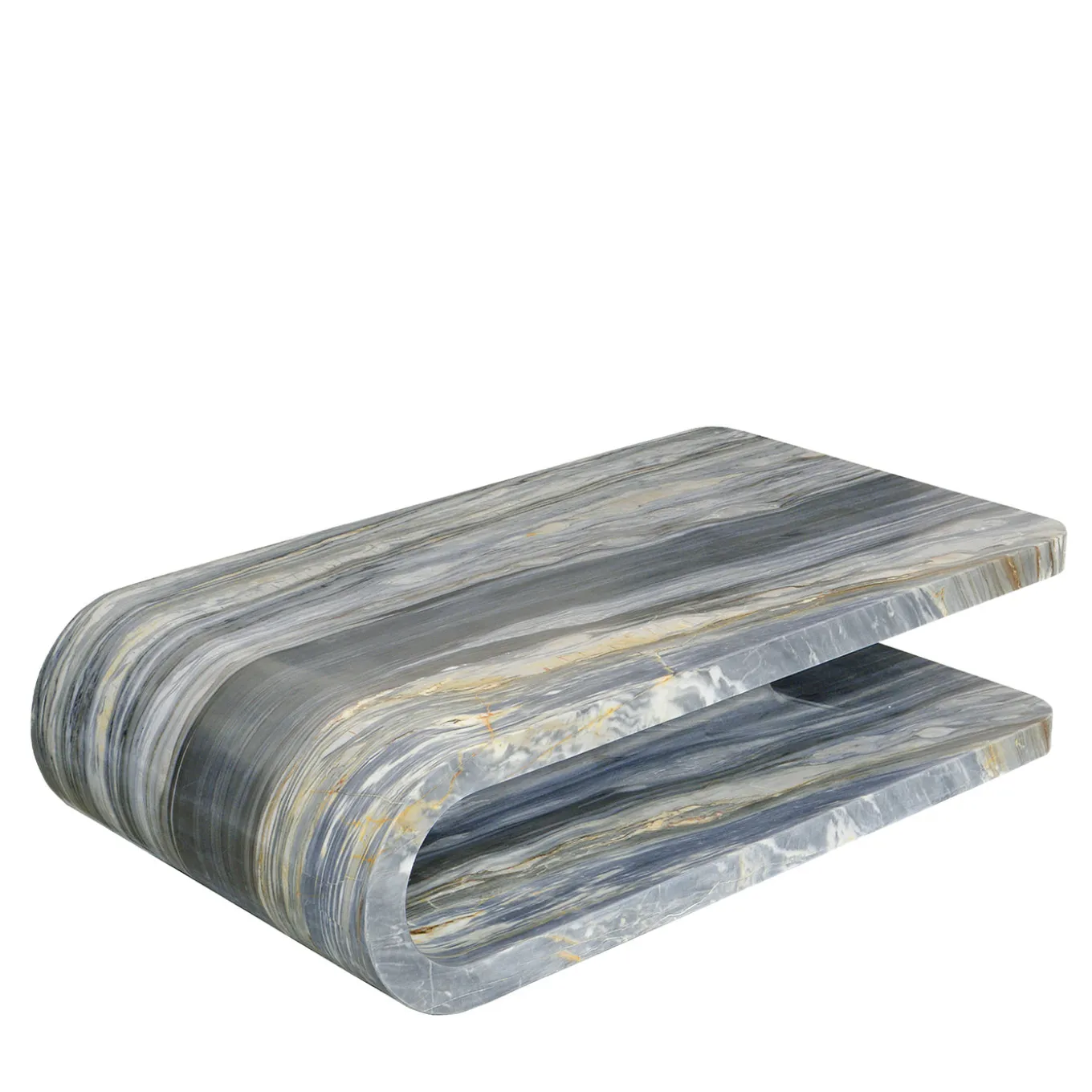 Fold Calacatta Midnight marble coffee table is carved from a single block, featuring fluid, folded geometry that contrasts softness with the stone’s inherent strength. Advanced CNC machining creates precise curves and smooth transitions, while hand finishing enhances natural texture and warm tones. It includes a generous integrated lower shelf for practical storage. This sculptural piece blends innovation and tradition, offering a striking presence in any interior.