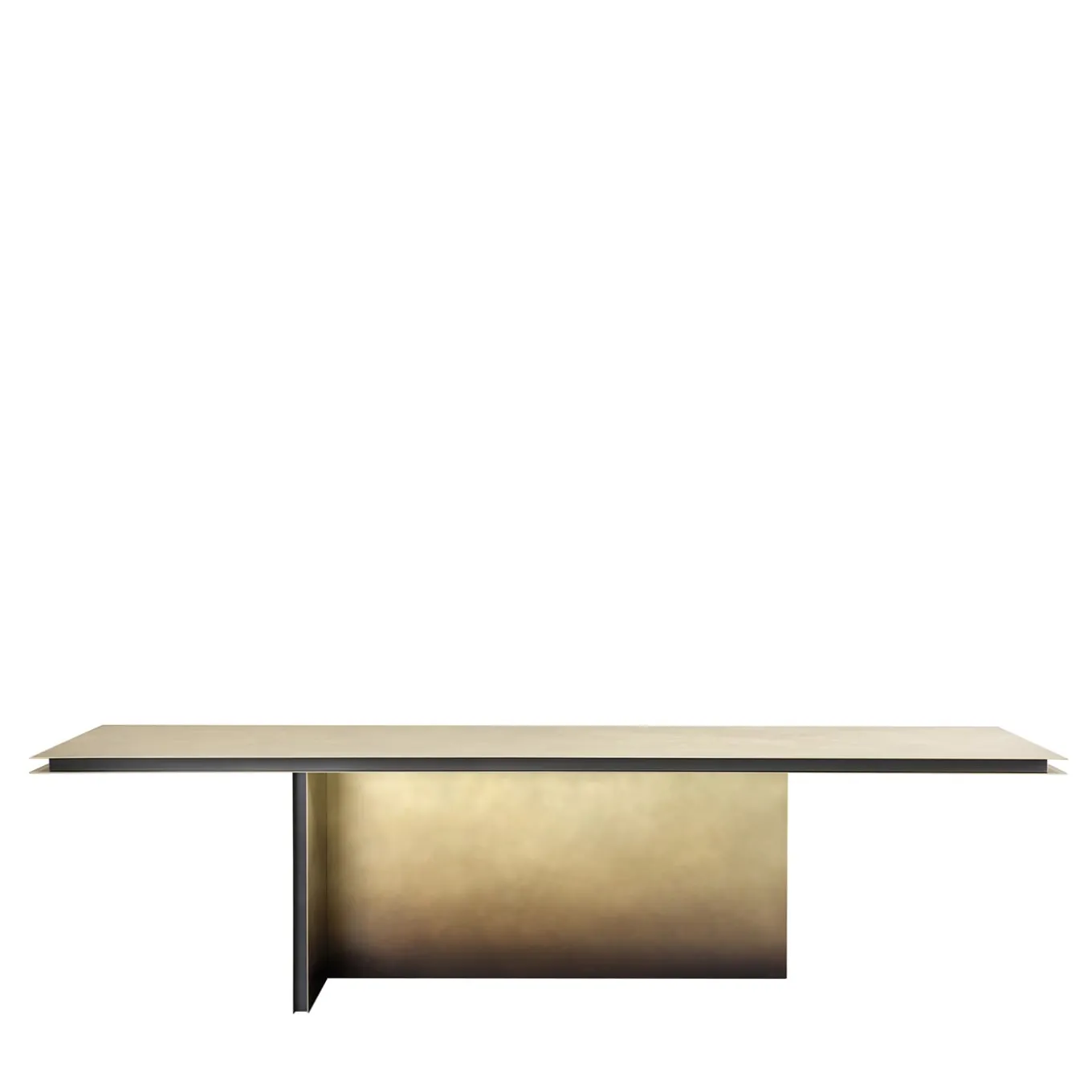 The pure, precise lines of the Folio table collection are composed of perpendicular planes of metal sheet. Equidistant sheets of metal punctuate the shape of Folio, giving rise to an interesting interplay of shadows, in contrast to the light reflected upon the horizontal plane. The tables are available with a round or a rectangular top and the base is carefully designed to ensure enough leg room while seated.