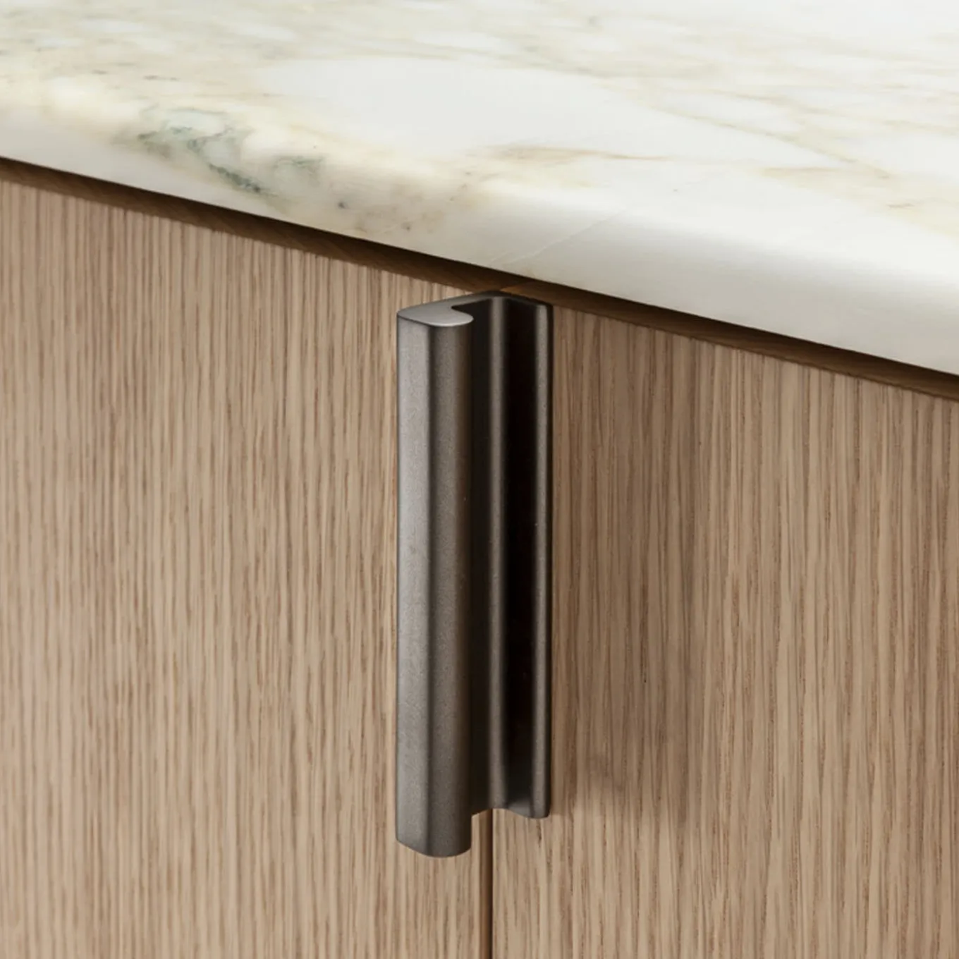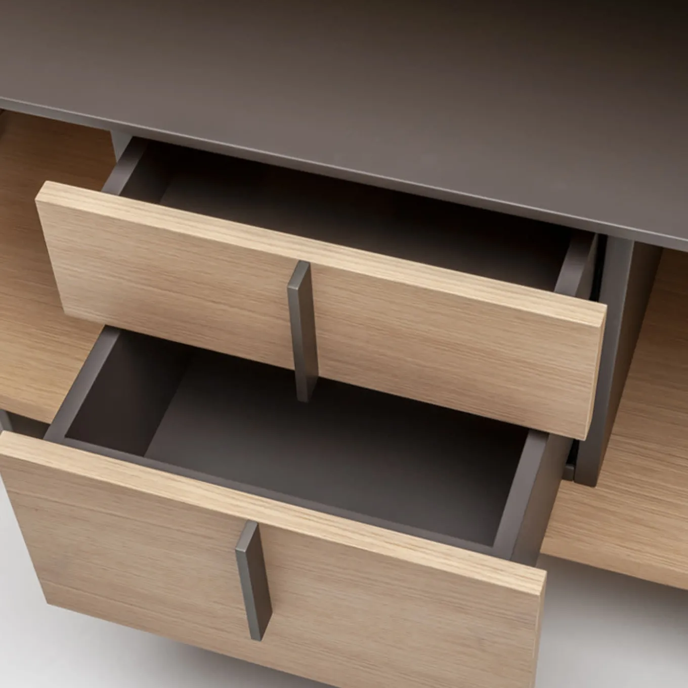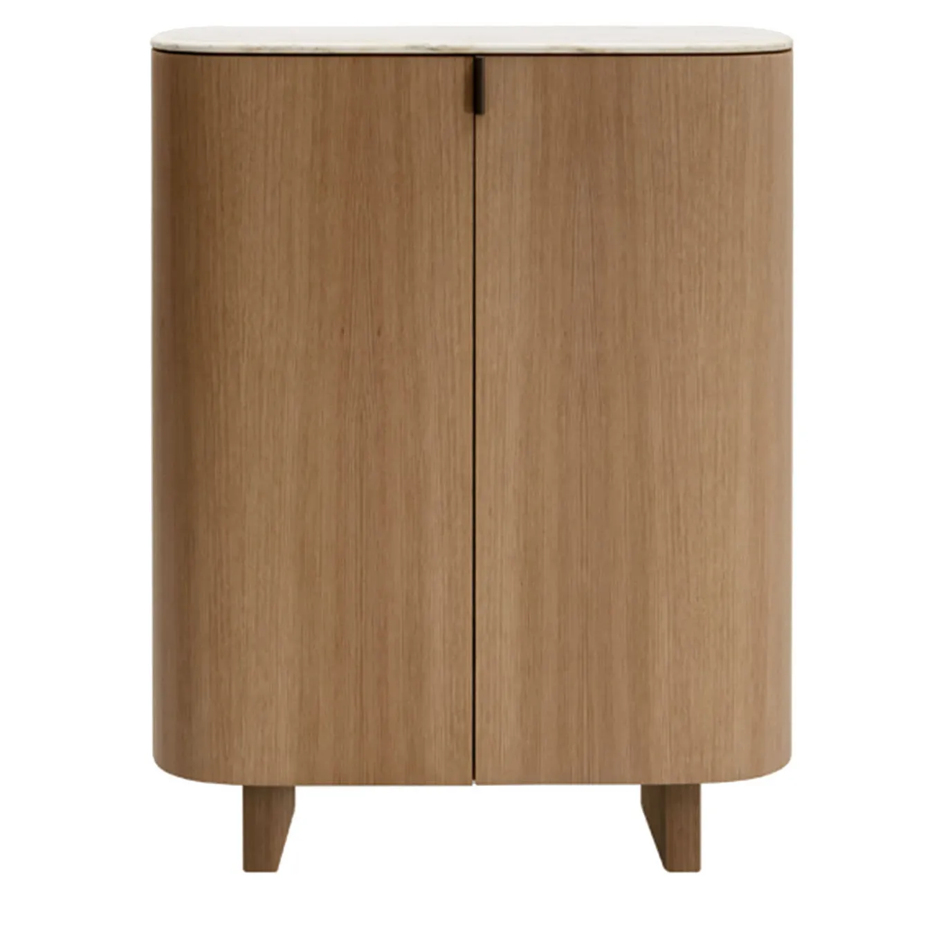 Folio cabinet is a part of a family of sideboards and cabinets featuring curved lines. Handcrafted by master artisans and covered in precious veneer with natural oak and Calacatta marble.