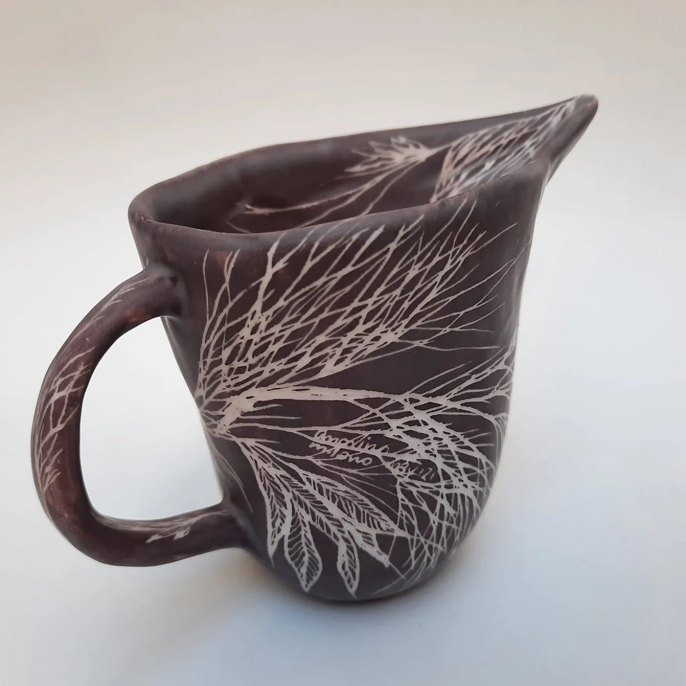 This singular milk jug celebrates the beauty of handmade ceramics through intricate, manual etchings of flora. Leaves and flowers are painstakingly etched from the exterior, which is finished in matte brown with a characteristic uneven distribution of color that is implied in the piece’s artisan quality. It makes for a superb pairing for cups and mugs by Amodino that share the same aesthetic inspiration.