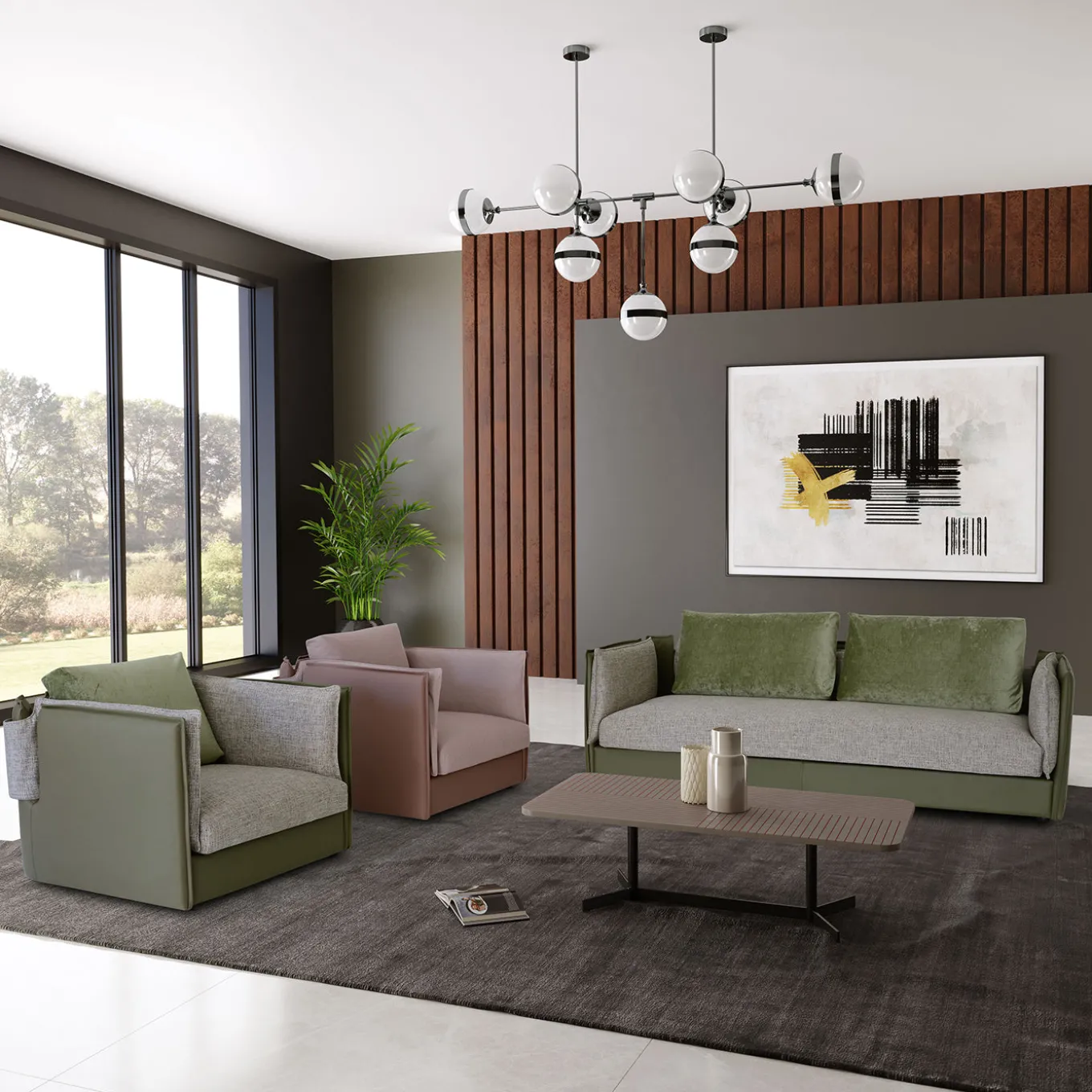 Foy green soft armchair offers a medium-sized seating option designed to create a welcoming and comforting space. Its enveloping form resembles a protective nest, intended for relaxation, solitude, or shared moments. The armchair features a combination of smooth outer surfaces and plush cushions in complementary soft textures, emphasizing both visual appeal and comfort. Perfect for environments that value aesthetic beauty. Cushions included.