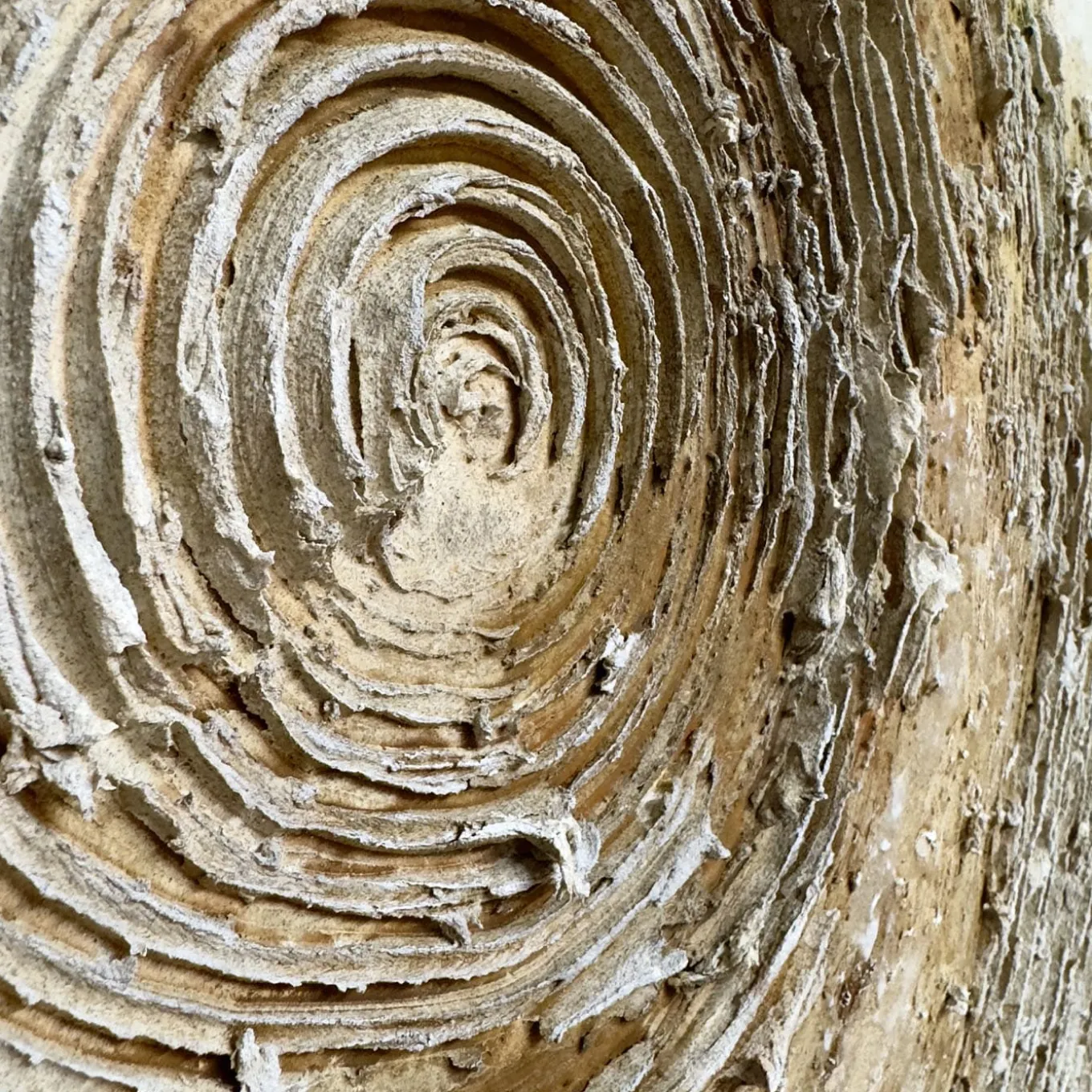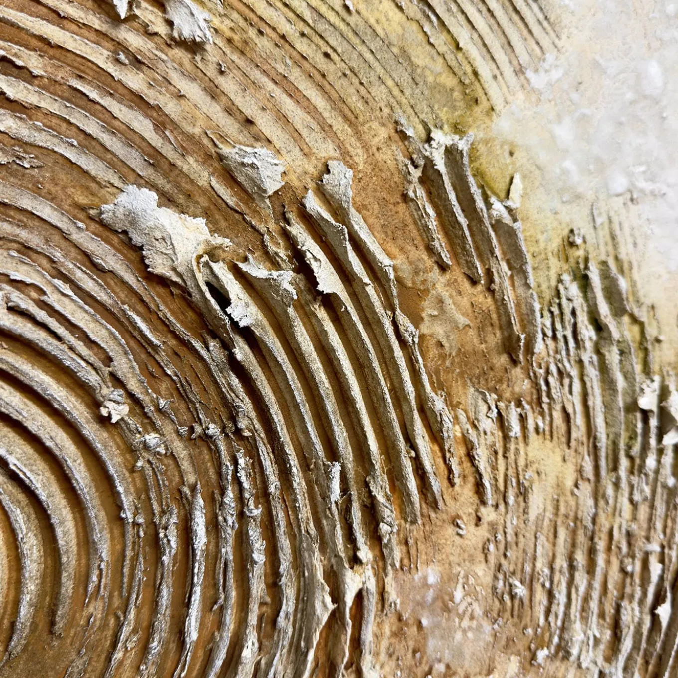 A meditation on fragmentation and wholeness, this painting expresses the dynamic tension between nature’s order and disorder. The central broken circle symbolizes an evolving relationship between organic matter and human influence. Subtle transitions between burnt earth tones, sage green, and golden ochre infuse the piece with depth. Crafted with resin and sand, it balances bold relief textures with soft, eroded finishes, making it ideal for contemplative or serene interiors. One-of-a-kind piece.