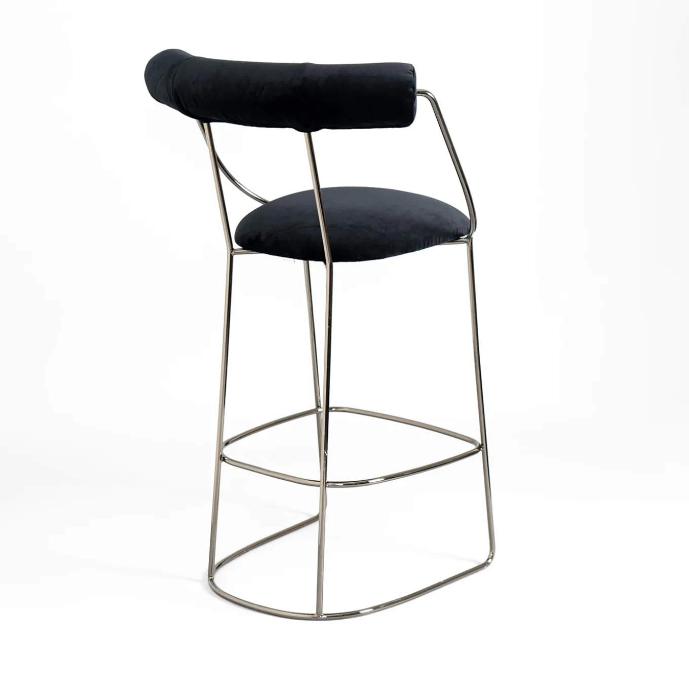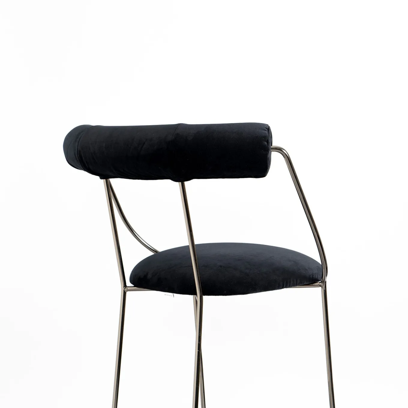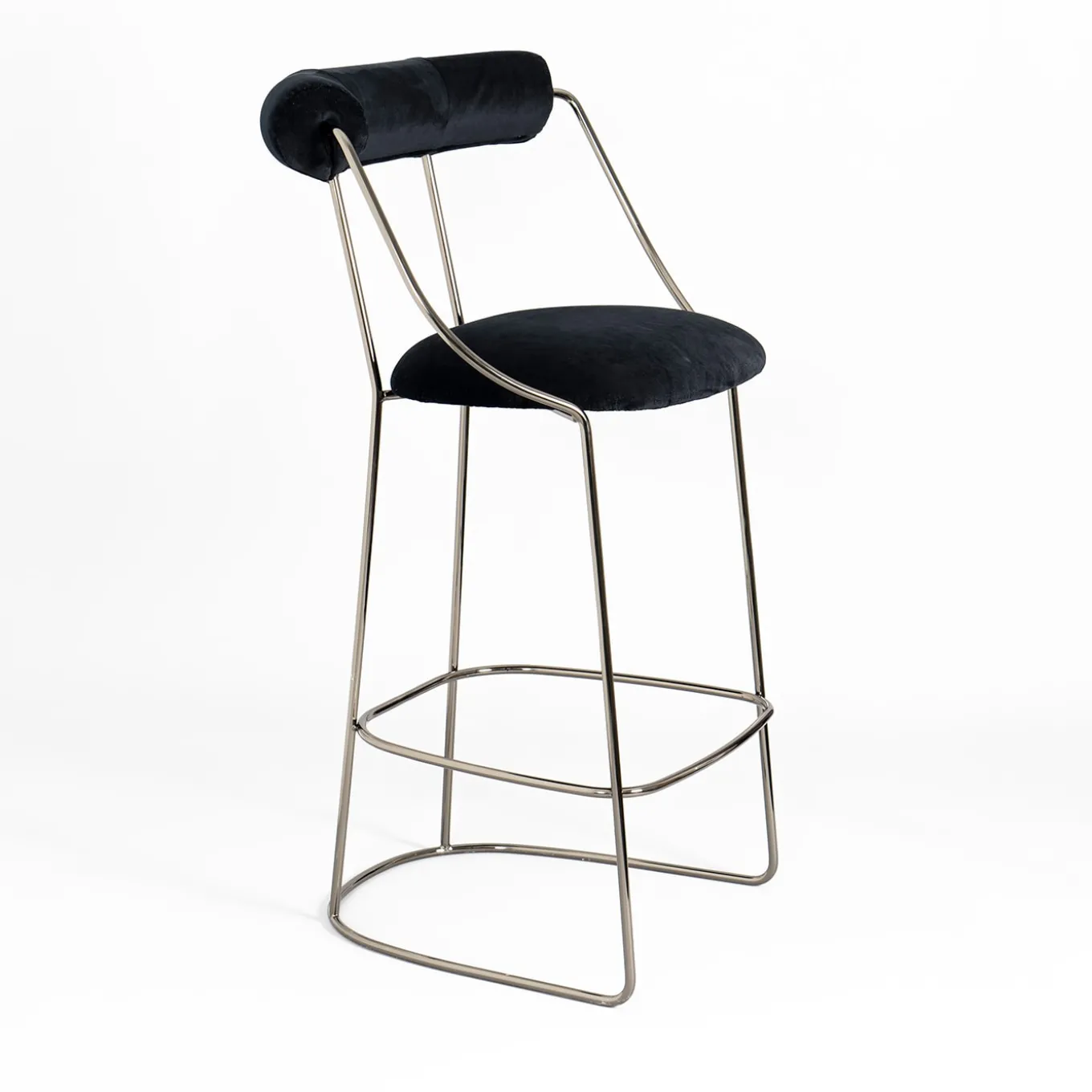 A reinterpretation of the Fran Chair, this exquisite stool is distinguished by a sleek, linear profile that seamlessly connects every composing element. Handmade of metal, finished in ultra black, brushed brass, or polished gold upon request, the structure is enriched with a softly padded seat and backrest, upholstered with black velvet, also customizable upon choice. Please contact the Concierge for further information.