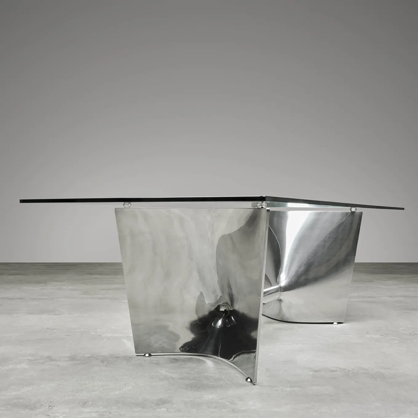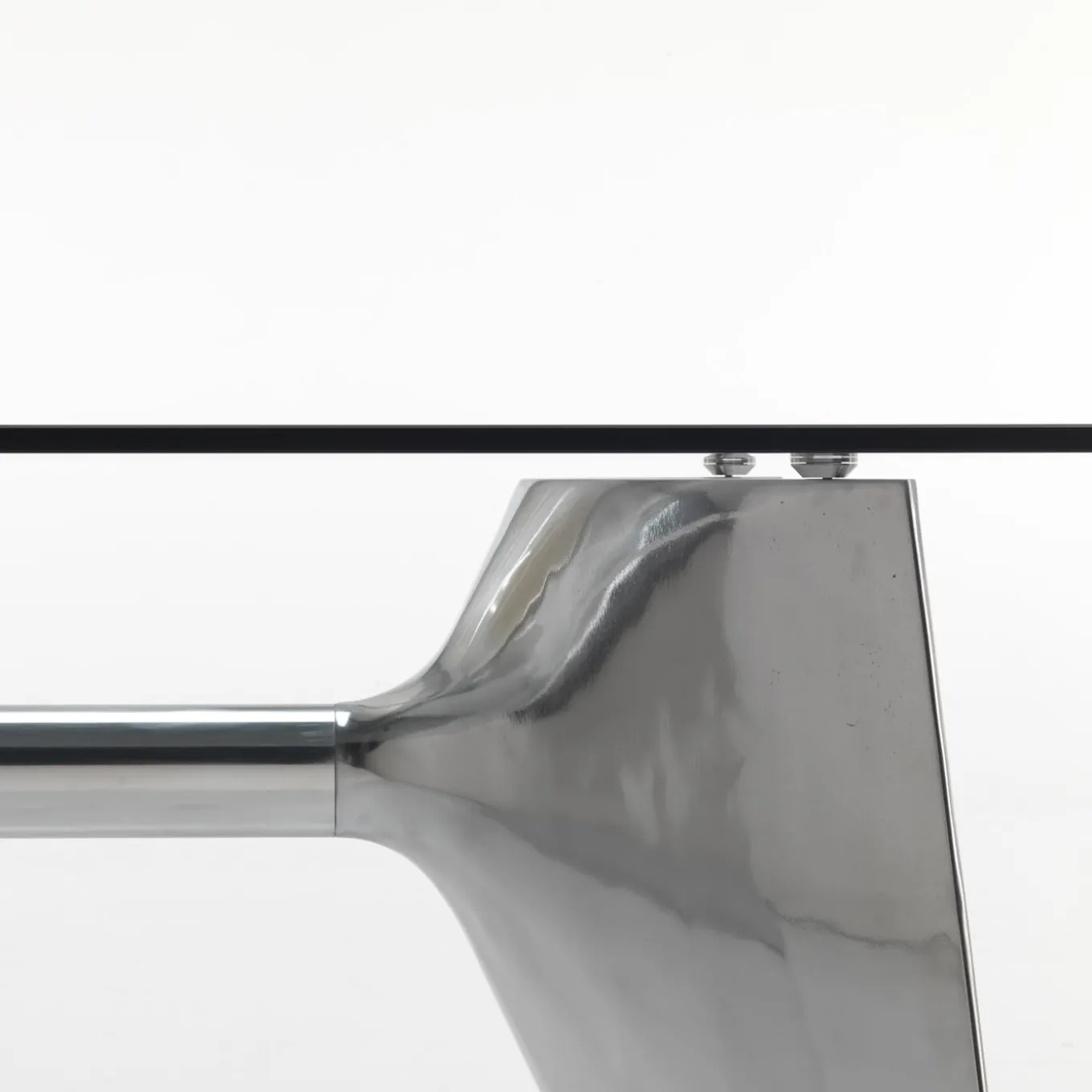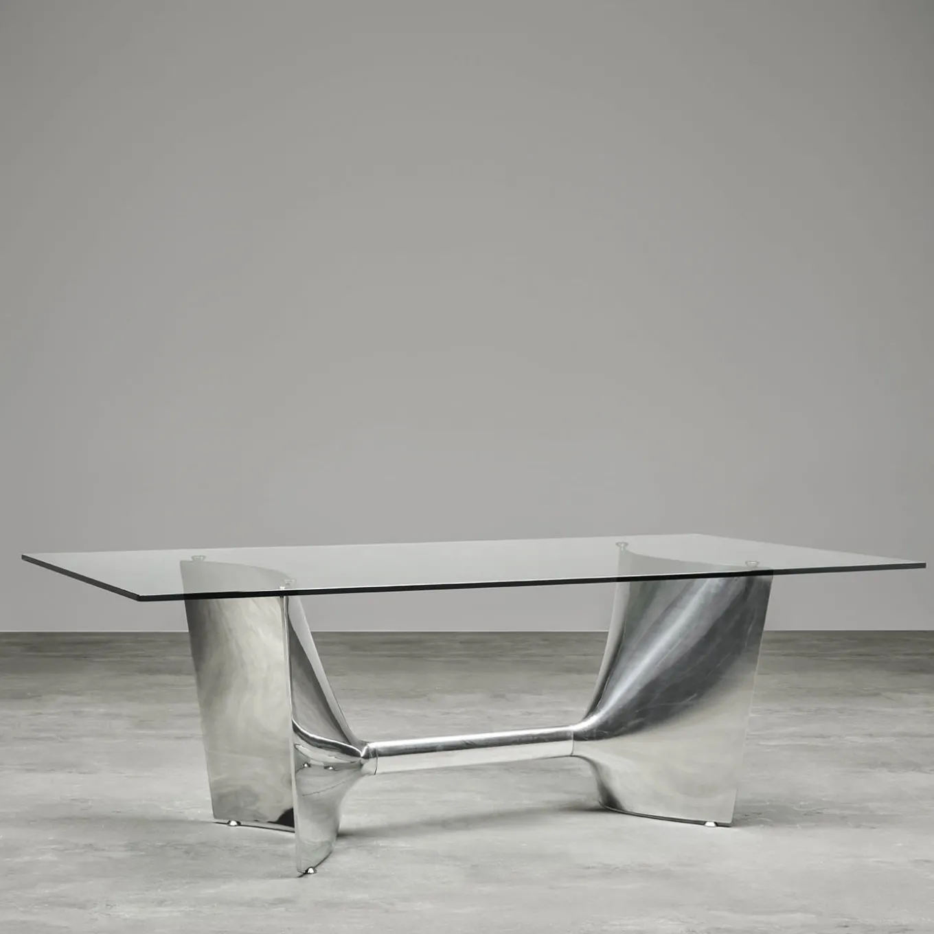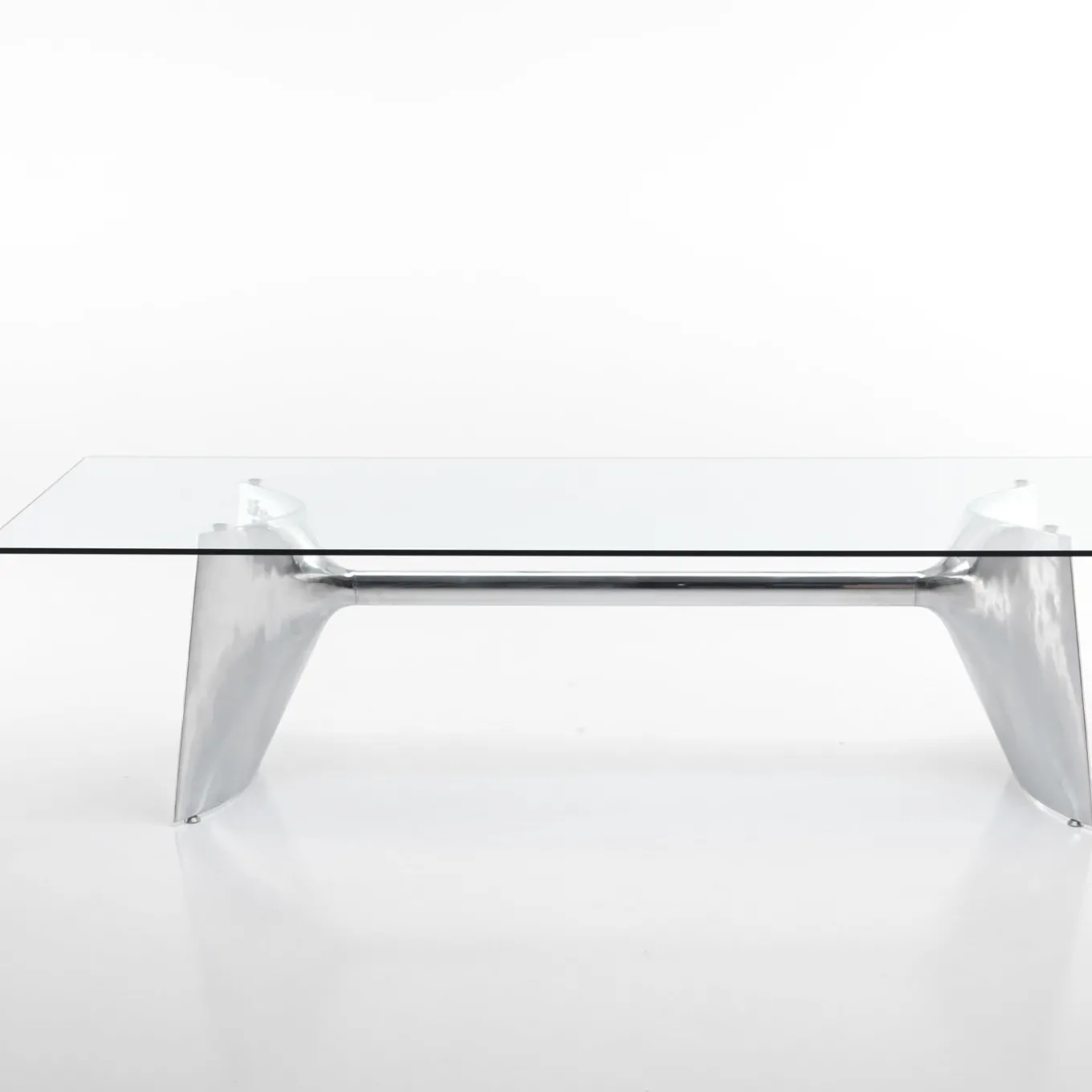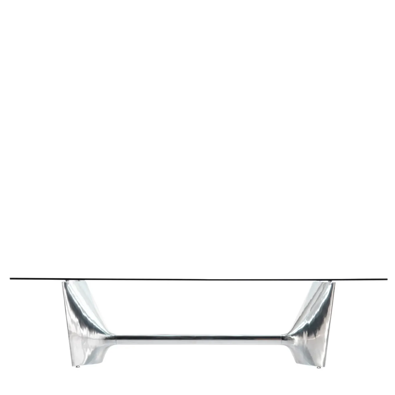 Designed by Jeff Miller, this elegant table showcases a stunning combination of materials that will enliven a modern dining room with shimmering style. The rectangular top is fashioned of extra-clear tempered glass that allows full view of the extraordinary base of polished aluminum composed of two mirroring shell-cast pediments connected with an extruded elliptical beam. The base can be turned upside-down and used with the central beam on top. Available also with top in MDF, natural teak, natural, or mocha-finished ash, and in other sizes match the customizable base.