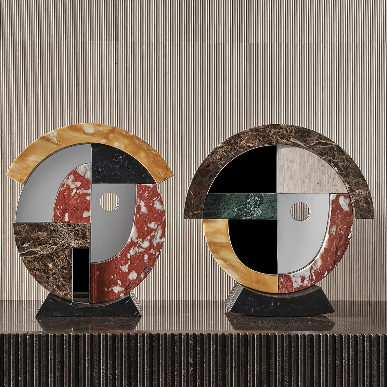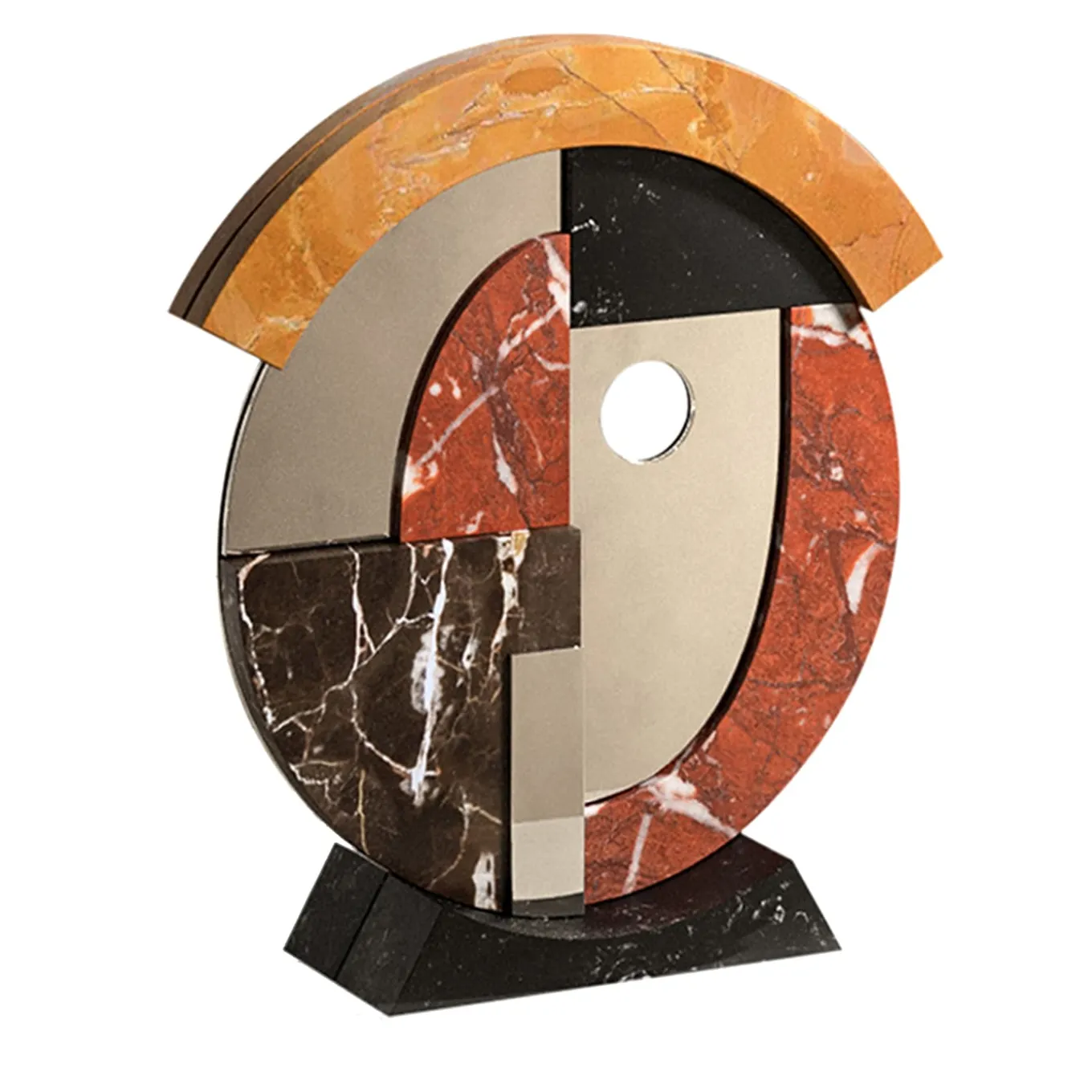 A hybrid between a vaguely anthropomorphic sculpture and a piece of functional decor, this table mirror is sure to infuse bedroom or bathroom decors with eccentric artistic allure. Mirrored glass pieces are combined with an array of different prized marbles, in a stimulating selection of unique veins and color tones. The use of natural stone and the impeccable craftsmanship make this piece an authentic objet d’art.