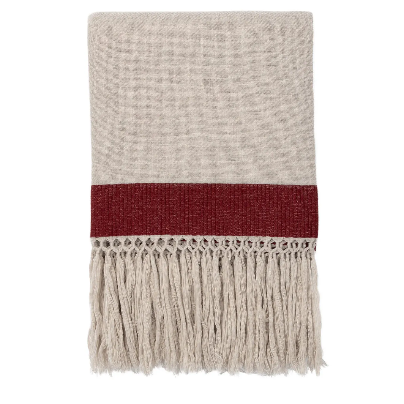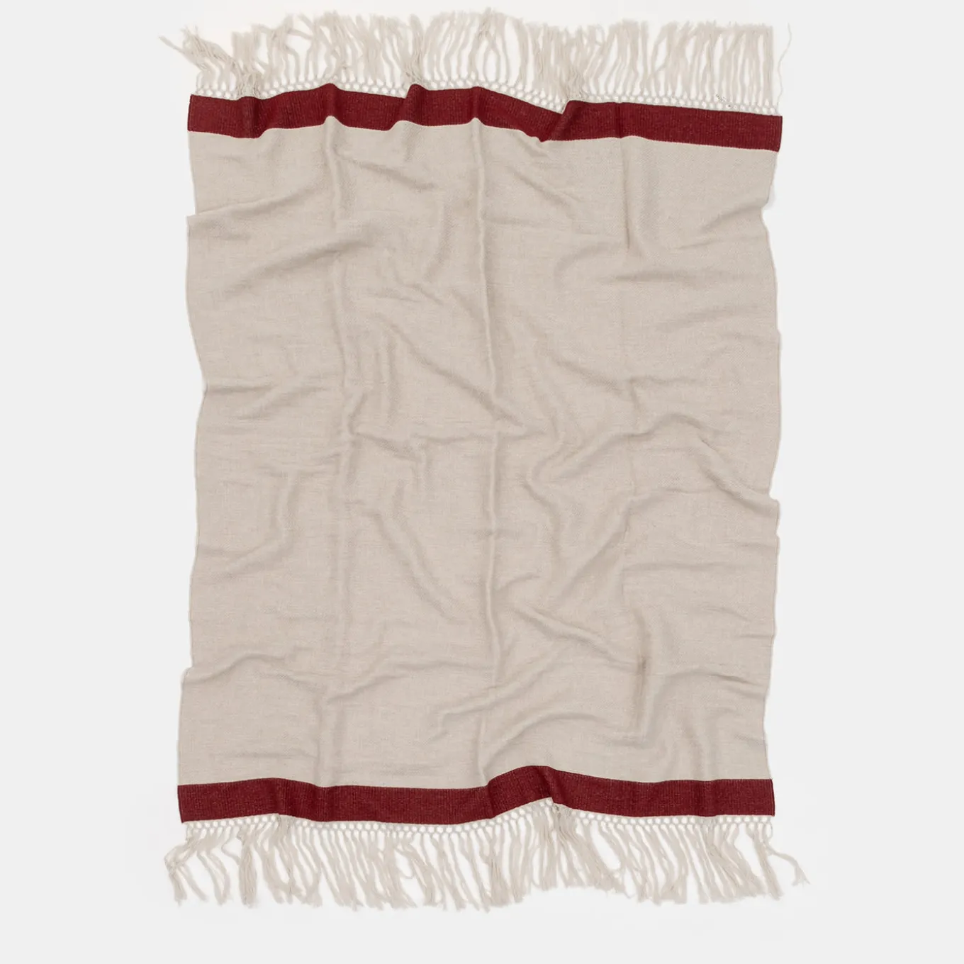 Precious yarns of fine Merino wool were the ones minutely selected for crafting this sophisticated blanket. Enlivened by 20cm-long fringes deftly knotted by hand, its simple and refined design acquires a pop of color thanks to the addition of a deep-red decorative band. A trusted ally for enhancing moments of pure relaxation, it is available in more color options.