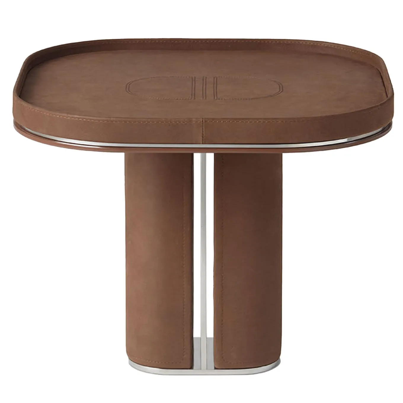 A showcase of sartorial elegance, this side table is sure to accent living spaces with a warm dash of exclusivity. Fine brown leather envelops both the shaped solid-wood legs and rounded-cornered metal top, while glossy steel profiles add subtle brightness to the piece. Equipped with a lacquered MDF top fitted to its underside, the top flaunts an elegant tone-on-tone embroidery.