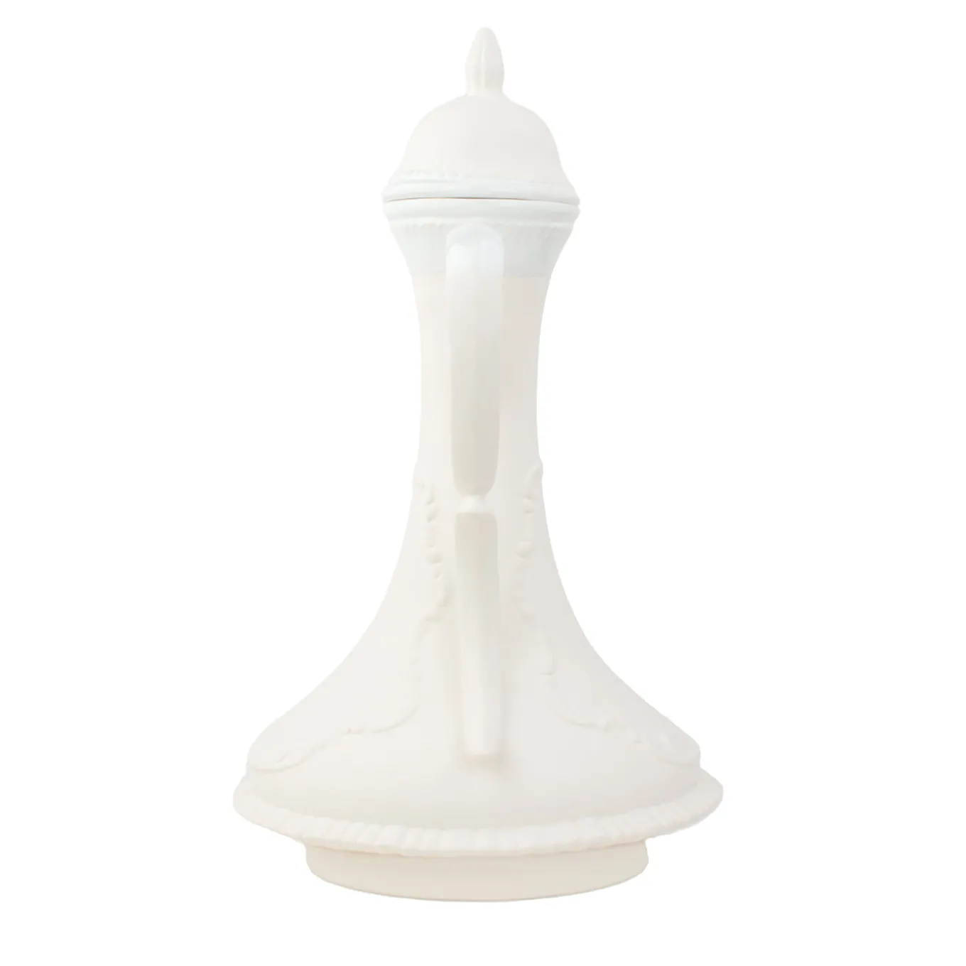 The Futura 03 ceramic coffee pot stands 50 cm tall and features a striking design inspired by baroque ceramics. Its sculpted surface combines raw biscuit ceramic with glossy white enamel applied selectively to the interior, handle, and dome-shaped lid, offering a refined contrast in texture and finish. The arabesque lines, sweeping handle, and detailed motifs evoke a playful yet contemporary reinterpretation of classic domestic forms. Designed by Paola Navone for LANDO, this piece is part of the Futura collection, which distills baroque excess into poetic and radical decorative objects. The coffee pot is available in additional height options of 40 cm, 32 cm, and 23 cm. Contact the Concierge for further information.