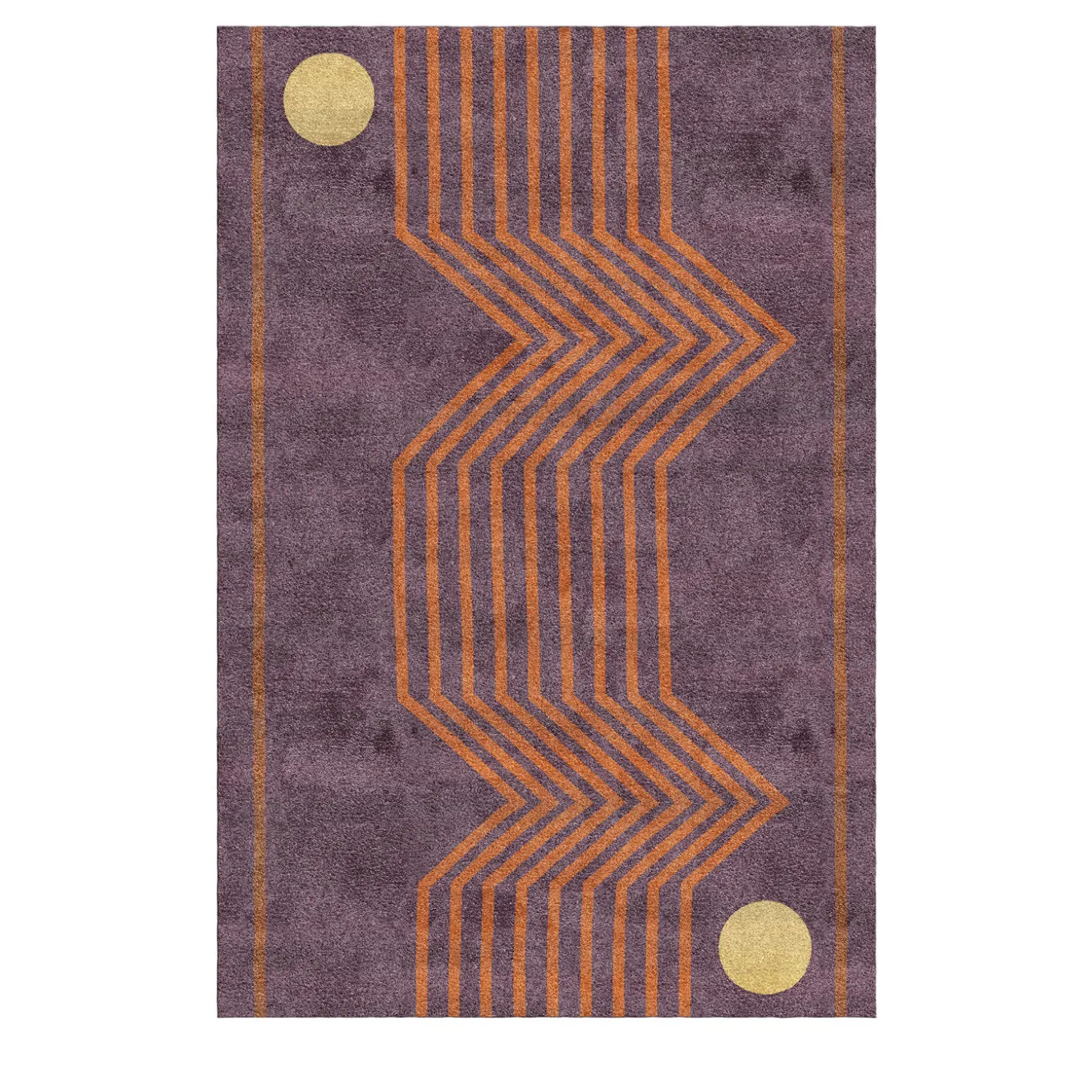 Captivating in its simple design and use of colors, this rug is a work of art by designer Vanessa Ordonez. Inspired by different styles experienced during her life travels, this European hand tufted linen and bamboo fibers rug flaunts a visually striking decoration composed of a rigid yet dynamic ensemble of red geometric lines, juxtaposed to the balance and harmony of two round yellow circles completing the top left and bottom right corners of this burgundy piece. Colors and size are customizable upon request to the Concierge.