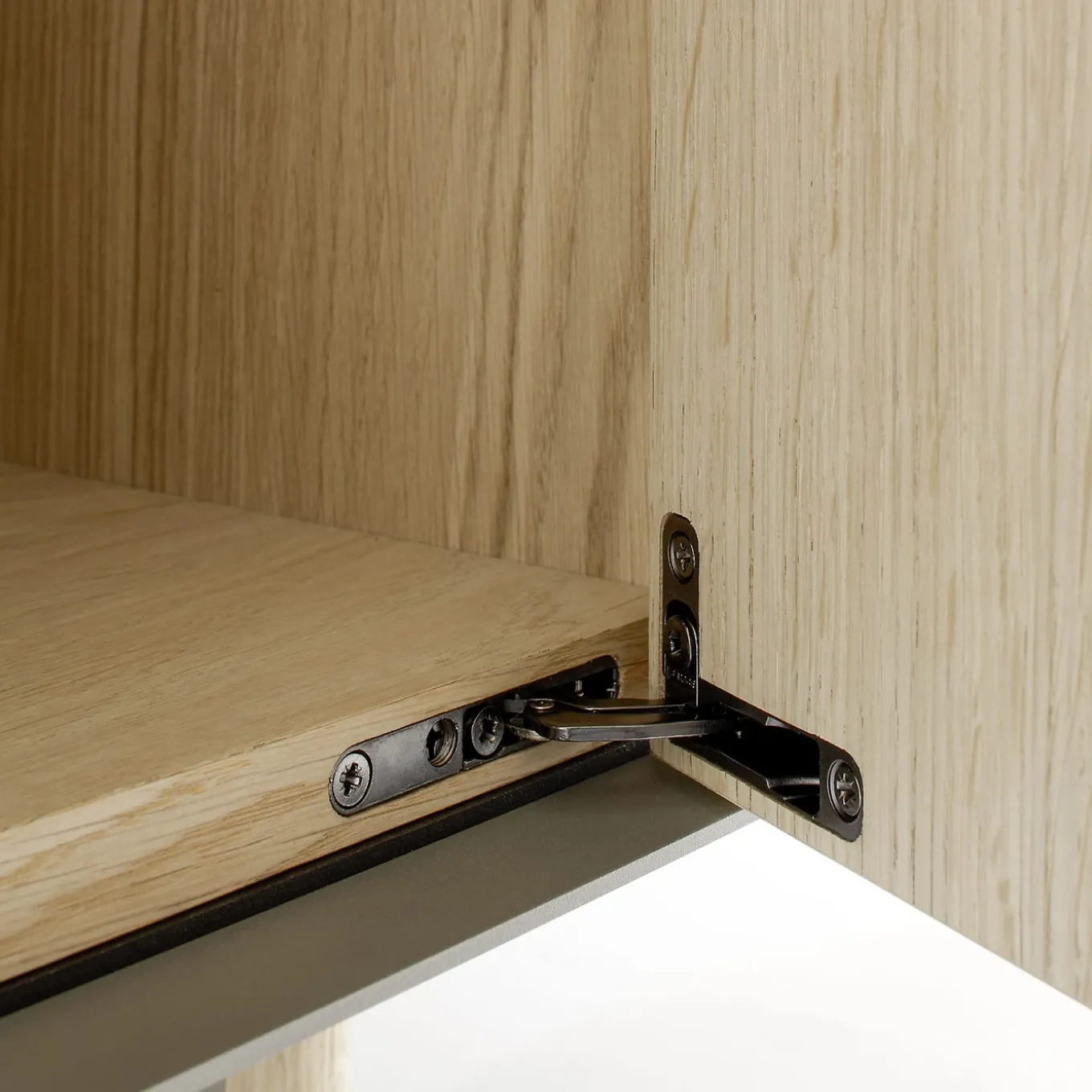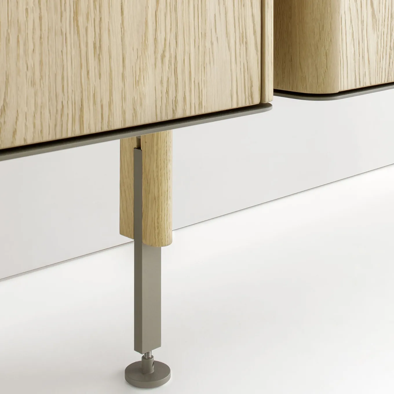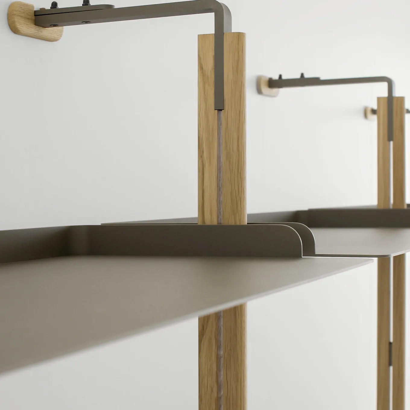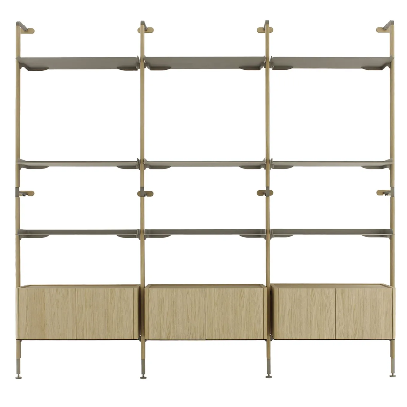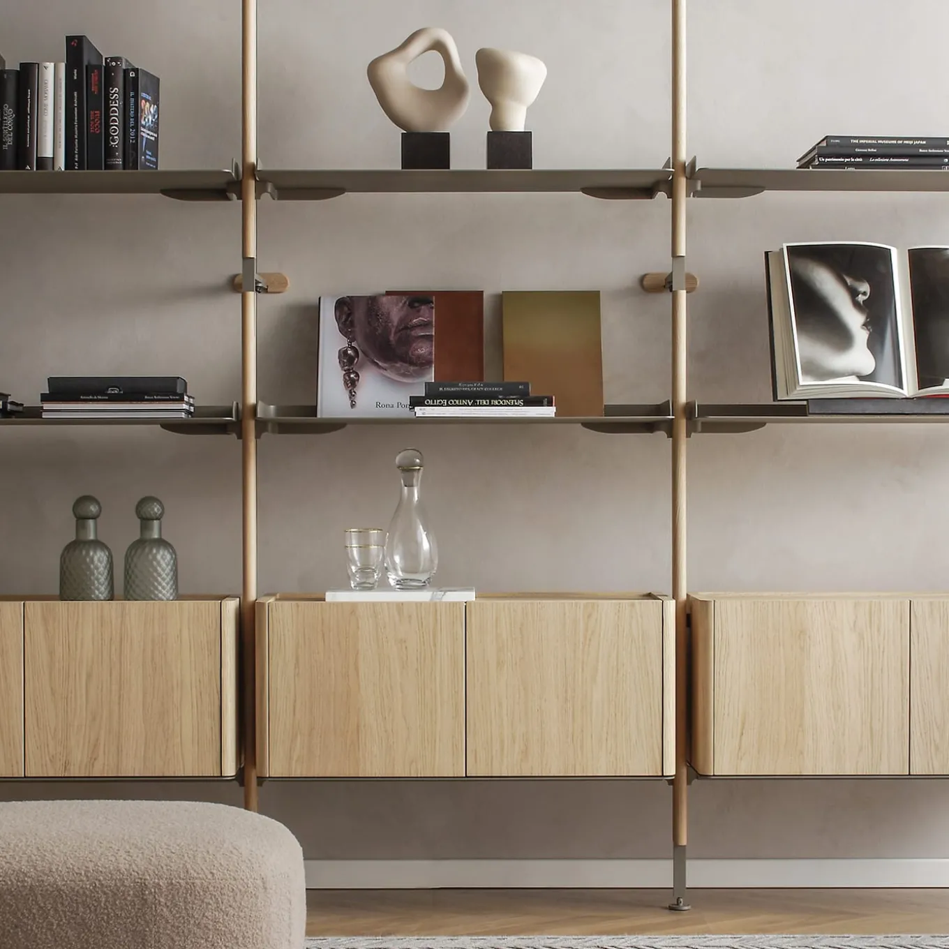 Distinguished by its modular design and timeless elegance, this wall composition features natural oak uprights, champagne metal shelves, and curved storage boxes in natural oak veneer MDF. The assembly includes a sturdy champagne metal mounting system with solid wood covers. Each module offers customizable options with shelves and optional storage, making it both versatile and stylish in a classic beige hue. Please contact the Concierge for more details.