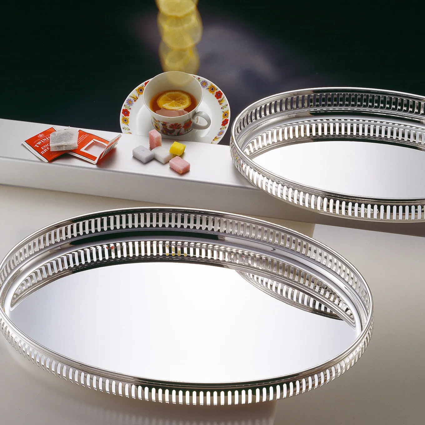 Magnificent oval serving tray beautifully made in “Lega Plus”, an alloy of copper treated with a unique finish. The finish is created by a galvanic plating treatment using a mixture of metals the formula of which is exclusive. This technique bestows extreme brilliance and shine on each piece while at the same time making it stainless and resistant to scratches.