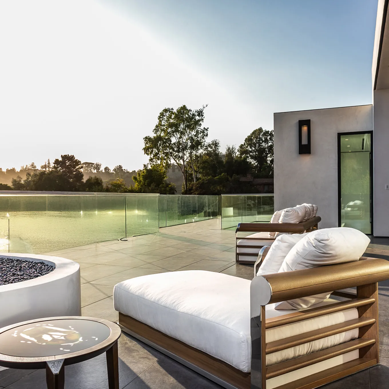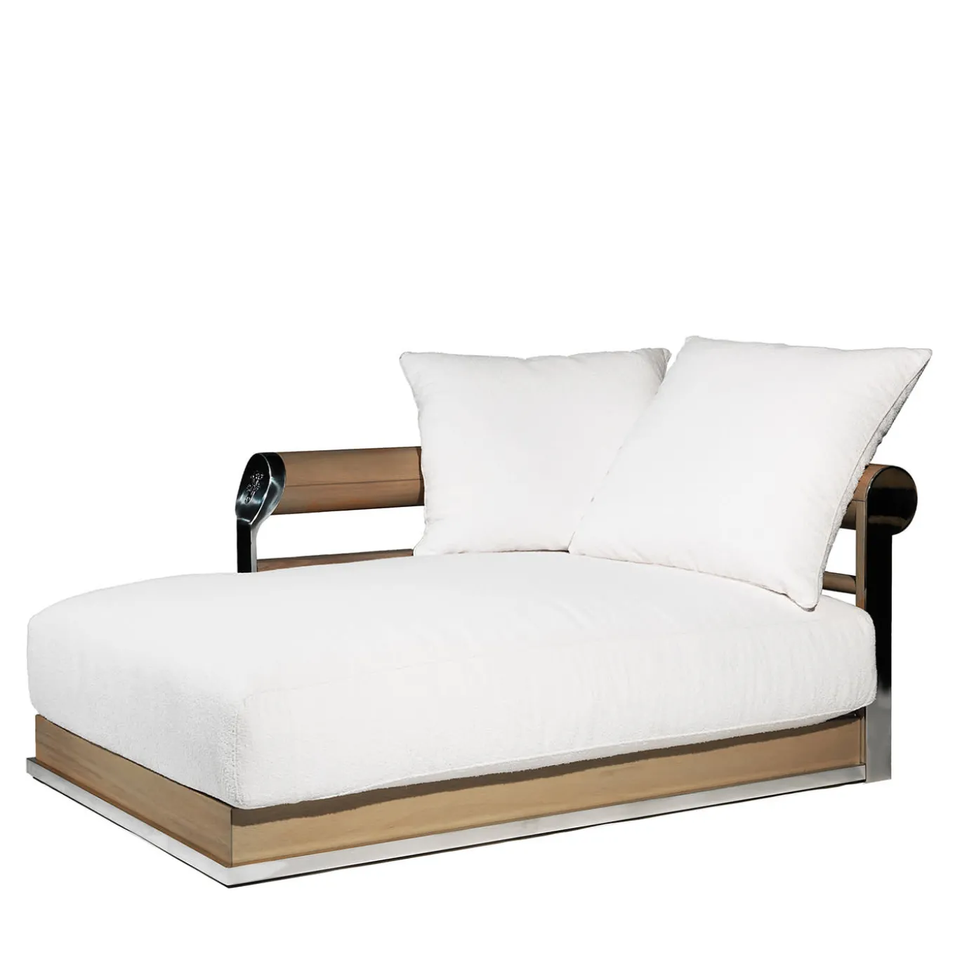 The Galloway outdoor sofa features a solid iroko wood and birch plywood structure with a stainless steel base. The armrests are finished with polished aluminum patches and a curved brass logo in chrome. Padding includes polyurethane and Memory Foam® for comfort. The Freestyle version has a backrest with loose cushions. Upholstered in white, waterproof Vivienne fabric with removable covers.
