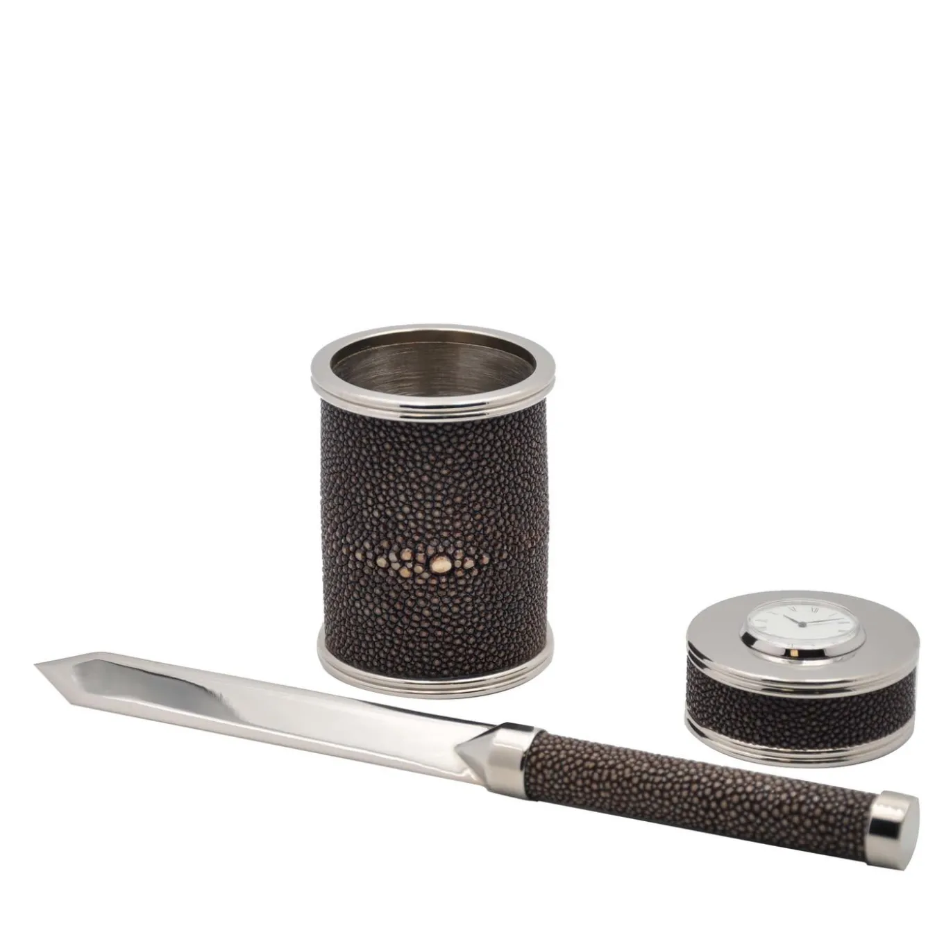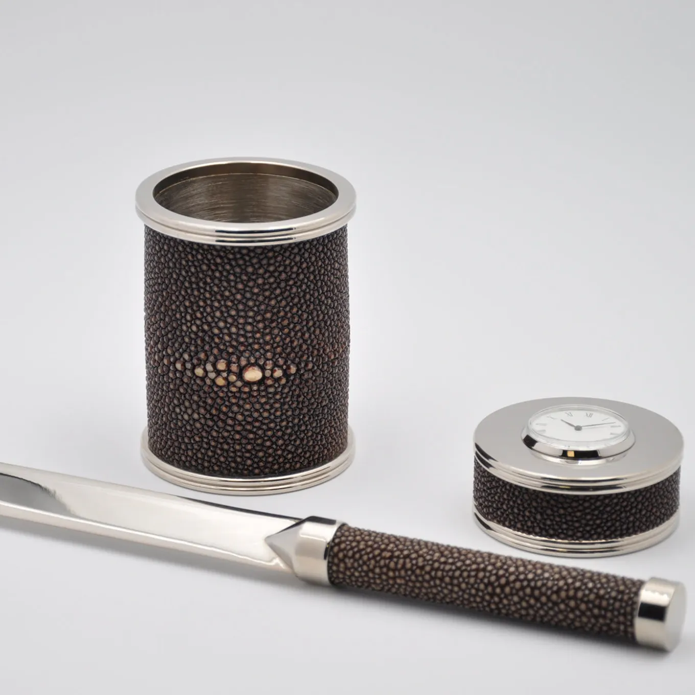 From Galucharme Collection in coffee chromatic color, this is a very special and high-class desk gift set, consisting of a pen-holder, a letter-opener and a clock-paperweight, with metal finish in nickel-plated brass. It is covered in shagreen skin, the decorative and fashinating leather composed with a myriad of pearl-like granules, that enhances the timeless of Art Decò style.