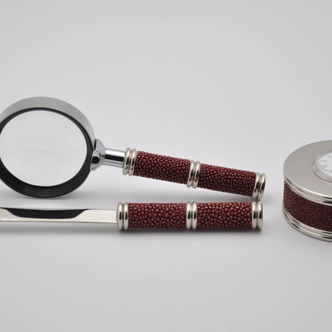 There are a lot of tales about Shageen. Supposedly, it was prized since the time of the pharaohs, and during the Chinese Han Dynasty (202 BC – AD 220). It was also used in the construction of bows. A wonderful desk set, with letter-opener, magnifying lens and clock-paperweight, from Galucharme Collection in shagreen in burgundy color with a nickel-plated brass.