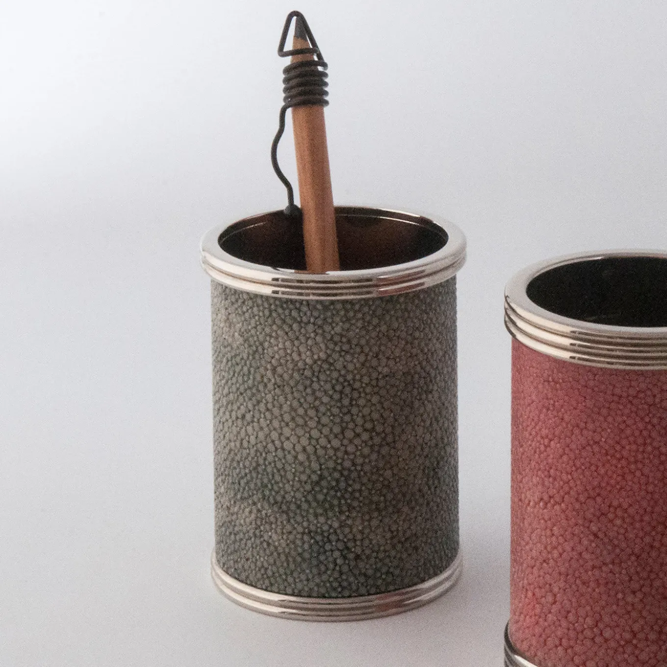 Part of the Galucharme Collection, whose name combines the French words “galuchat” (shagreen) and “charme” (allure), this pen holder embodies the concept that simplicity of purpose does not have to compromise design nor elegance. Covered entirely in sage-green shagreen full with polished nickel-plated top and bottom rims, this pen holder (Ø 9cm) comes in a black box (13x13xH. 11cm) with a care instruction leaflet.