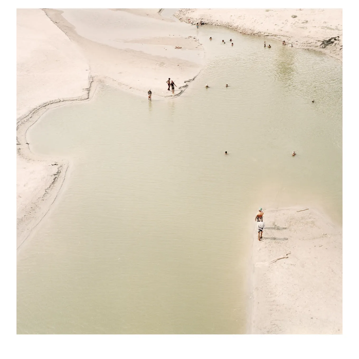 Drawing inspiration from the quiet harmony between human life and nature, this fine art print portrays a tranquil scene along the Ganges. Figures gently wade through the calm waters, surrounded by soft, sandy shores. The minimalist design and muted color palette evoke a sense of peacefulness while subtly hinting at the river’s fragile existence. This image beautifully captures both the spiritual and environmental significance of the Ganges, inviting deeper reflection.
