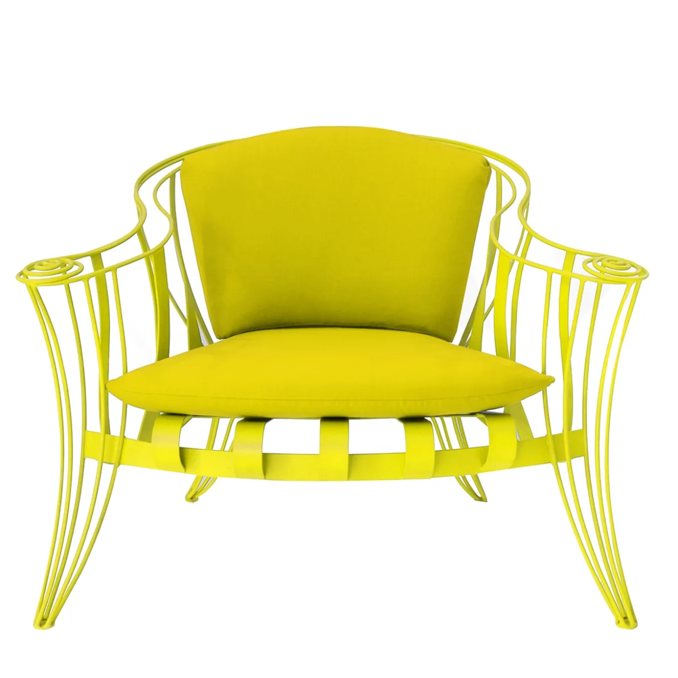 Part of the Opus Garden collection, this stunning outdoor armchair is an ideal addition to an eclectic patio or contemporary terrace. Its sinuous curves, distinctive of the Opus collection, were crafted of hand-bent iron that was treated with a rust-resistant yellow finish. This piece can be purchased with or without the seat and back cushions, please ask the Concierge for details and pricing.