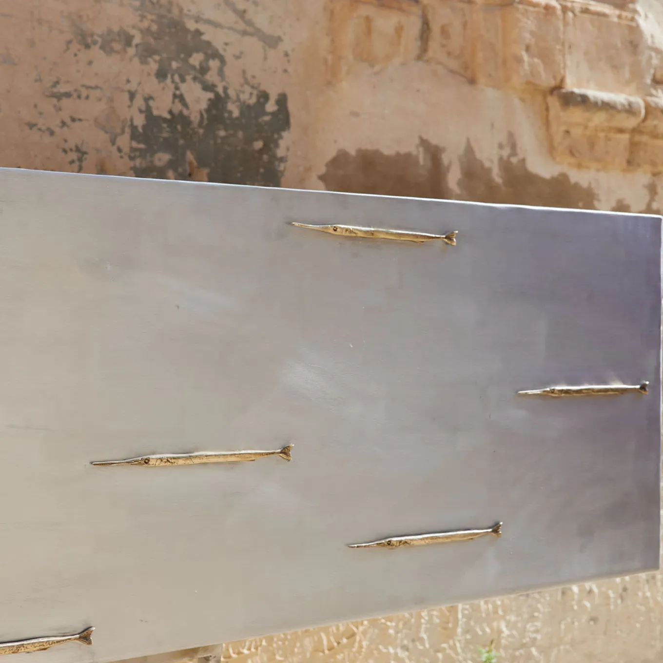An aluminum cabinet with bronze needlefish inserts made through the lost wax technique. Inspired by Fiorentino’s pictorial series of dreamers with fishes. As for the other Fiorentino furniture pieces and sculptures, the object is in itself a secret, which when found opens the sideboard and brings out the blue. In each piece, a different garfish opens the secret compartment within the sideboard.