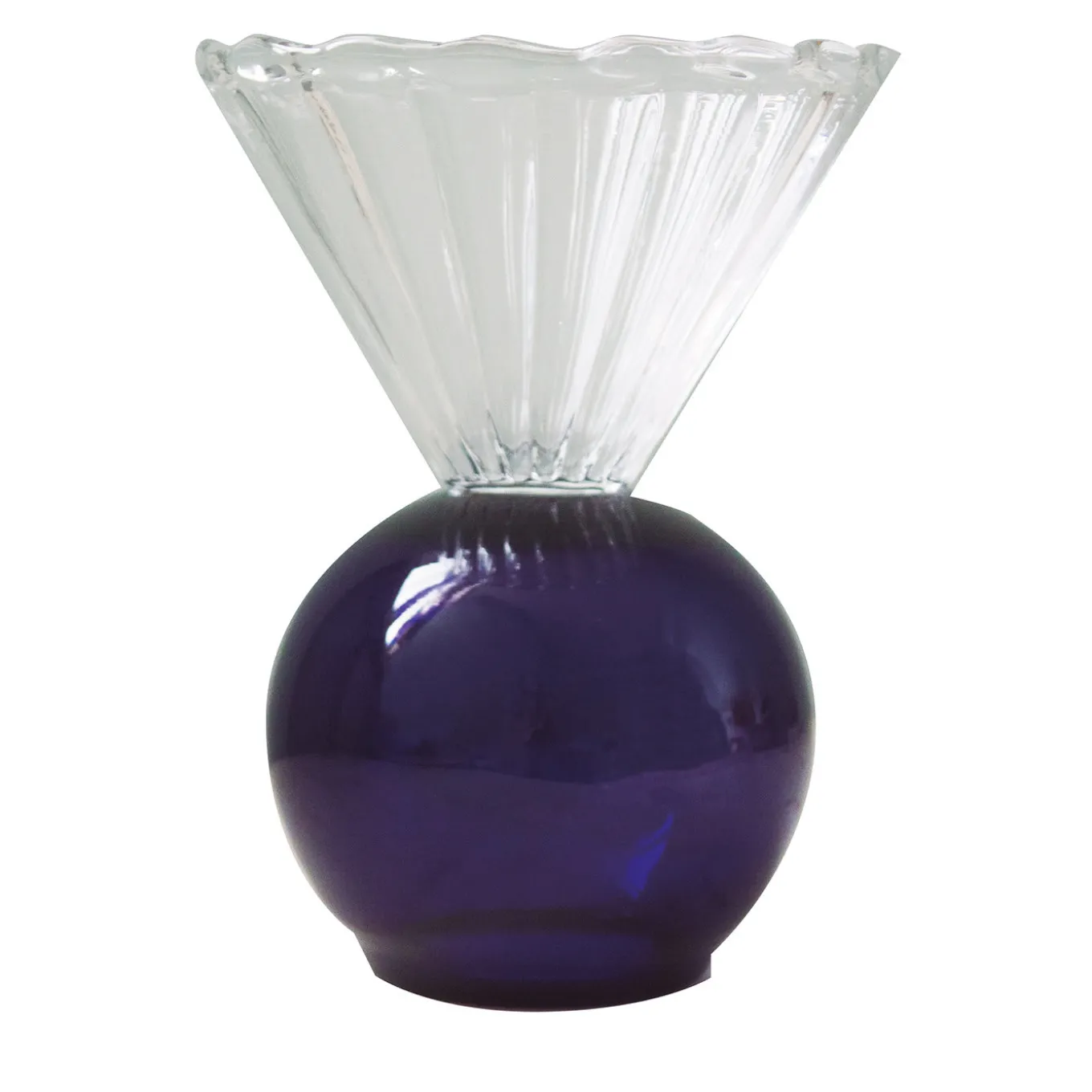 An impeccable synthesis between 19th-century traditional techniques and modern taste, this ice-cream bowl is handmade of prized crystal in blue and transparent shades. Its silhouette displays pure volumes, piling an upside-down conical cup marked by vertical ridges on a blue spherical base. The piece will shine as both a purely decorative item or arranged with a small plant or succulent.